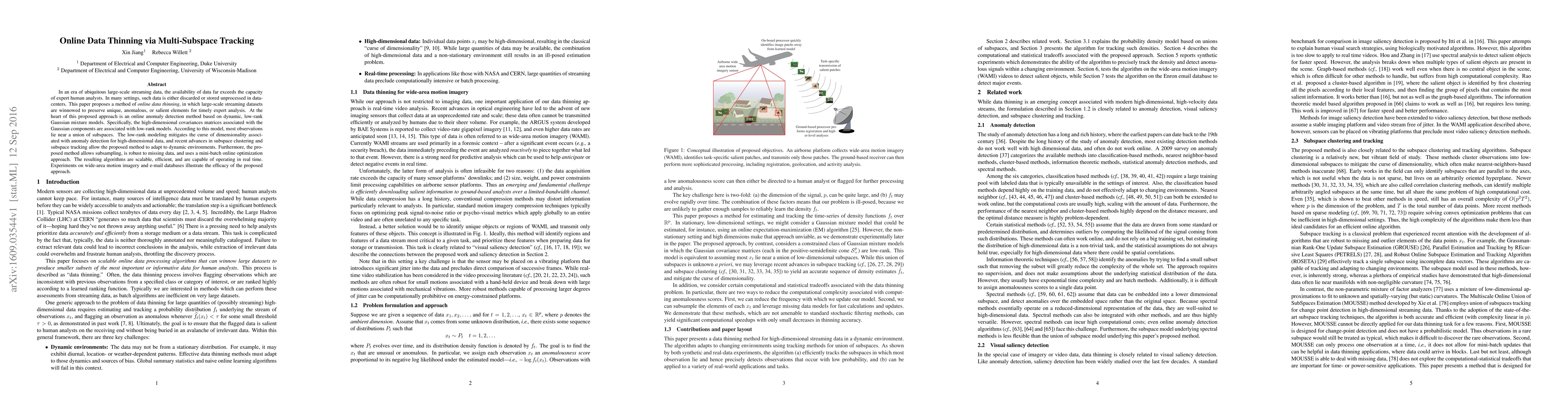 In an era of ubiquitous large-scale streaming data, the availability of data far exceeds the capacity of expert human analysts. In many settings, such data is either discarded or stored unprocessed in datacenters. This paper proposes a method of online data thinning, in which large-scale streaming datasets are winnowed to preserve unique, anomalous, or salient elements for timely expert analysis. At the heart of this proposed approach is an online anomaly detection method based on dynamic, low-rank Gaussian mixture models. Specifically, the high-dimensional covariances matrices associated with the Gaussian components are associated with low-rank models. According to this model, most observations lie near a union of subspaces. The low-rank modeling mitigates the curse of dimensionality associated with anomaly detection for high-dimensional data, and recent advances in subspace clustering and subspace tracking allow the proposed method to adapt to dynamic environments. Furthermore, the proposed method allows subsampling, is robust to missing data, and uses a mini-batch online optimization approach. The resulting algorithms are scalable, efficient, and are capable of operating in real time. Experiments on wide-area motion imagery and e-mail databases illustrate the efficacy of the proposed approach.