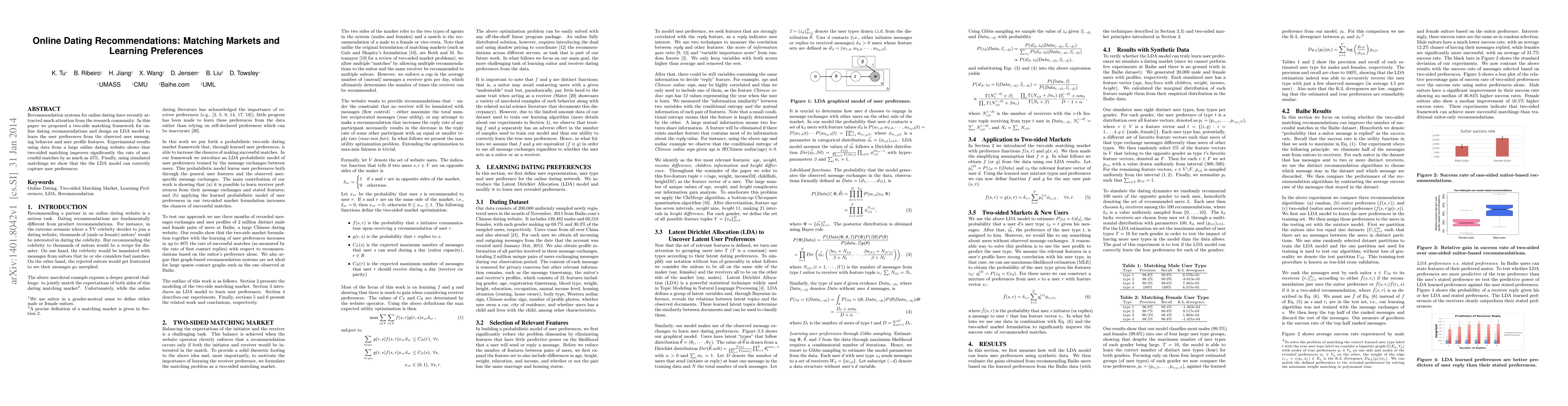 This paper proposes a two-sided matching framework for online dating recommendations, utilizing an LDA model to learn user preferences from messaging behavior and profile features. Experimental results indicate a 45% improvement in successful matches, and the LDA model effectively captures user preferences.