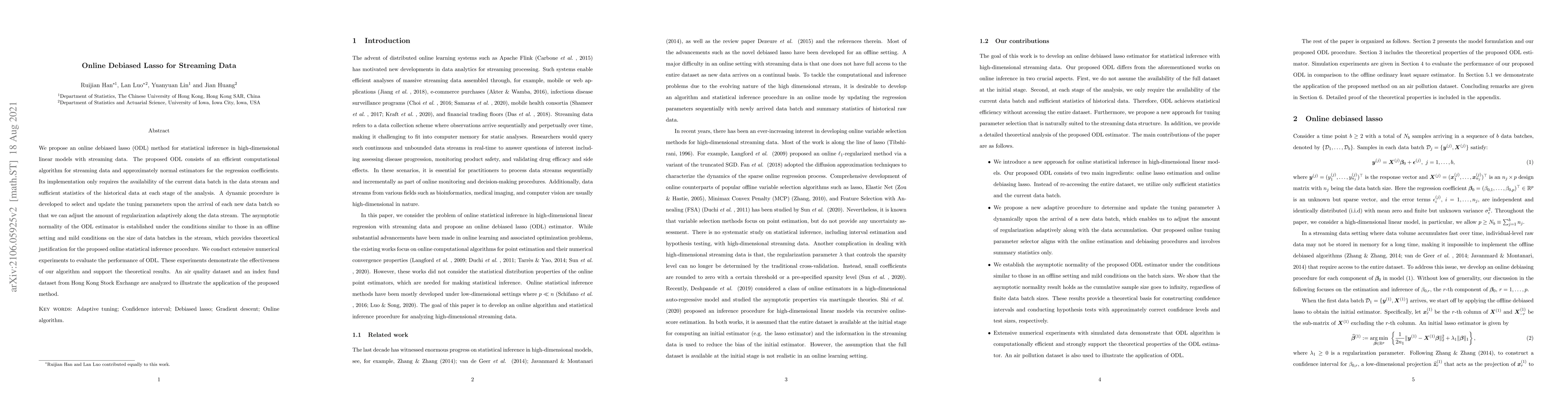 The paper introduces an online debiased lasso (ODL) method for high-dimensional linear models in streaming data, featuring an adaptive computational algorithm and dynamic tuning parameter selection. The method's asymptotic normality is theoretically justified, and its effectiveness is demonstrated through extensive numerical experiments and real-world datasets.