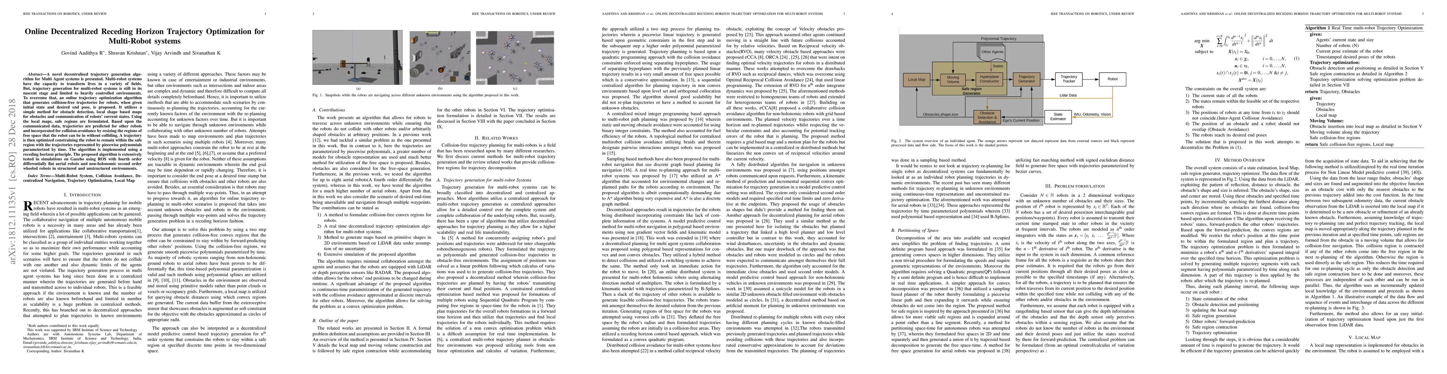 The paper introduces a decentralized, receding horizon trajectory optimization algorithm for multi-robot systems that uses B-spline parametrization, LiDAR-based obstacle detection, and prediction of other robots' trajectories to generate safe convex regions for collision avoidance.