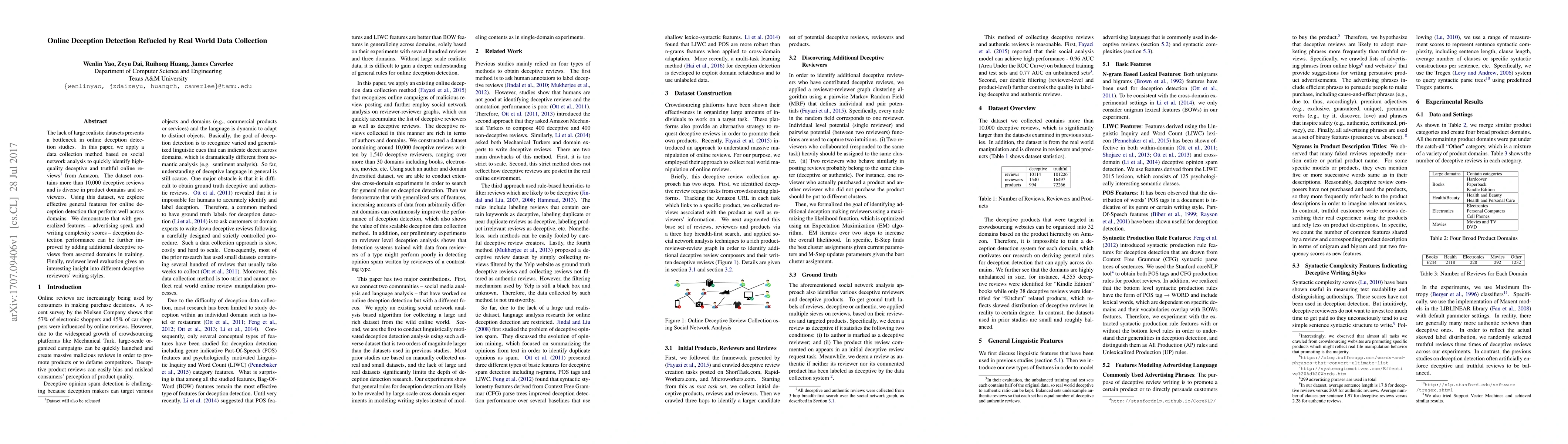Researchers developed a dataset of over 10,000 online reviews to improve deception detection on Amazon, finding that advertising speak and writing complexity scores can help detect deception across product domains.