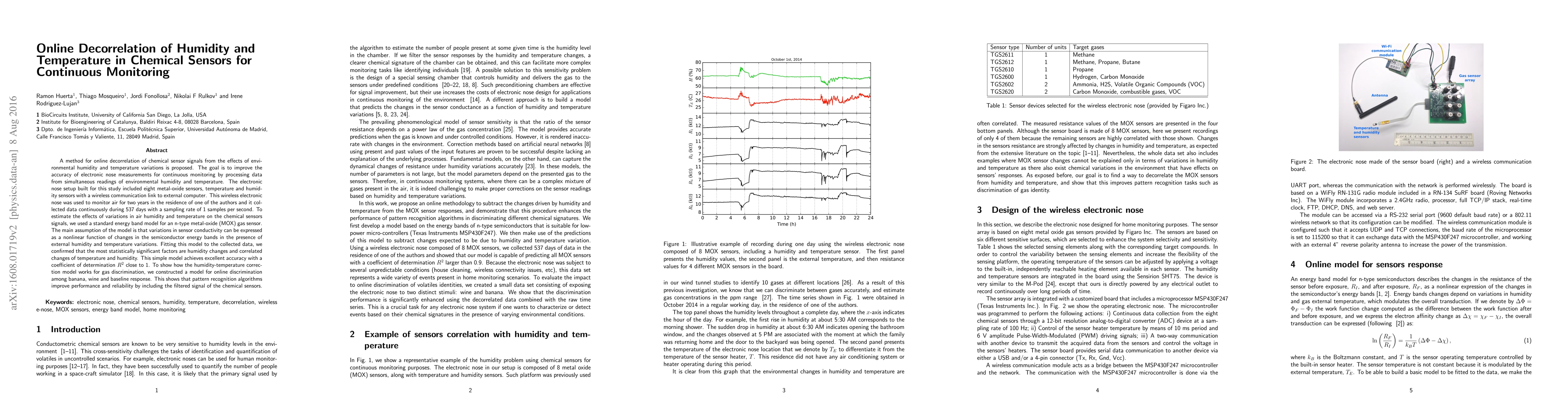 A method for online decorrelation of chemical sensor signals from the effects of environmental humidity and temperature variations is proposed. The goal is to improve the accuracy of electronic nose measurements for continuous monitoring by processing data from simultaneous readings of environmental humidity and temperature. The electronic nose setup built for this study included eight metal-oxide sensors, temperature and humidity sensors with a wireless communication link to external computer. This wireless electronic nose was used to monitor air for two years in the residence of one of the authors and it collected data continuously during 537 days with a sampling rate of 1 samples per second. To estimate the effects of variations in air humidity and temperature on the chemical sensors signals, we used a standard energy band model for an n-type metal-oxide (MOX) gas sensor. The main assumption of the model is that variations in sensor conductivity can be expressed as a nonlinear function of changes in the semiconductor energy bands in the presence of external humidity and temperature variations. Fitting this model to the collected data, we confirmed that the most statistically significant factors are humidity changes and correlated changes of temperature and humidity. This simple model achieves excellent accuracy with a coefficient of determination $R^2$ close to 1. To show how the humidity-temperature correction model works for gas discrimination, we constructed a model for online discrimination among banana, wine and baseline response. This shows that pattern recognition algorithms improve performance and reliability by including the filtered signal of the chemical sensors.
