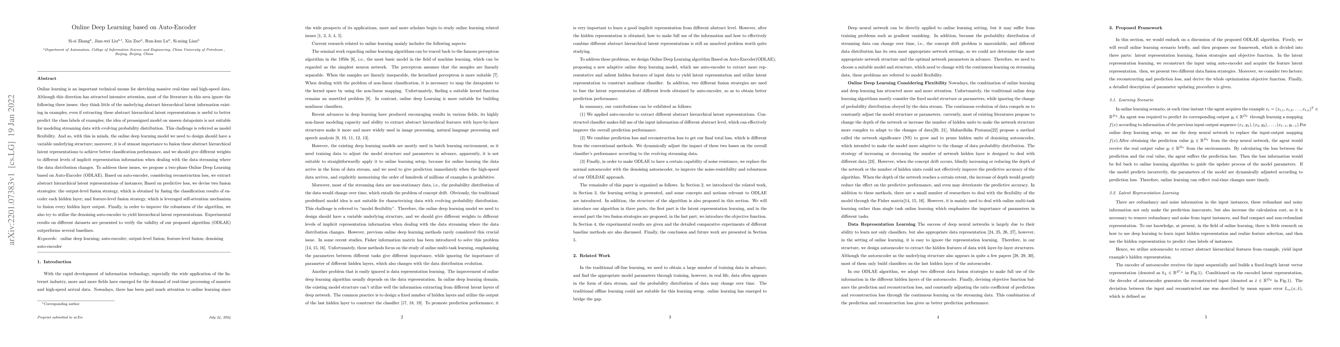 The paper proposes an online deep learning model based on auto-encoder (ODLAE) to address challenges in modeling streaming data, focusing on extracting hierarchical latent representations, improving model flexibility, and fusing these representations for better classification performance. Experimental results show that ODLAE outperforms baselines.