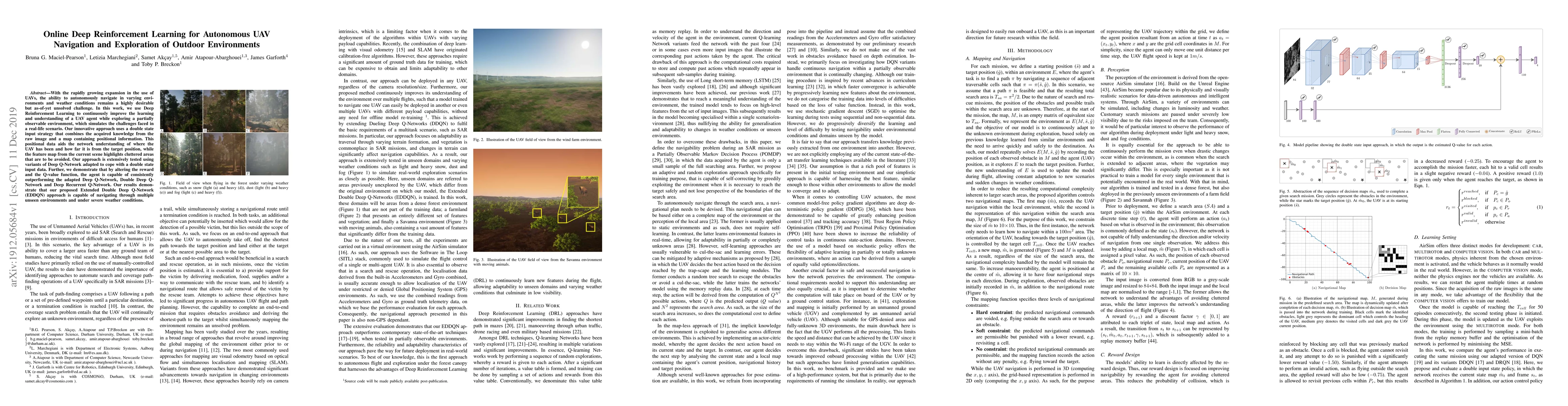 With the rapidly growing expansion in the use of UAVs, the ability to autonomously navigate in varying environments and weather conditions remains a highly desirable but as-of-yet unsolved challenge. In this work, we use Deep Reinforcement Learning to continuously improve the learning and understanding of a UAV agent while exploring a partially observable environment, which simulates the challenges faced in a real-life scenario. Our innovative approach uses a double state-input strategy that combines the acquired knowledge from the raw image and a map containing positional information. This positional data aids the network understanding of where the UAV has been and how far it is from the target position, while the feature map from the current scene highlights cluttered areas that are to be avoided. Our approach is extensively tested using variants of Deep Q-Network adapted to cope with double state input data. Further, we demonstrate that by altering the reward and the Q-value function, the agent is capable of consistently outperforming the adapted Deep Q-Network, Double Deep Q- Network and Deep Recurrent Q-Network. Our results demonstrate that our proposed Extended Double Deep Q-Network (EDDQN) approach is capable of navigating through multiple unseen environments and under severe weather conditions.