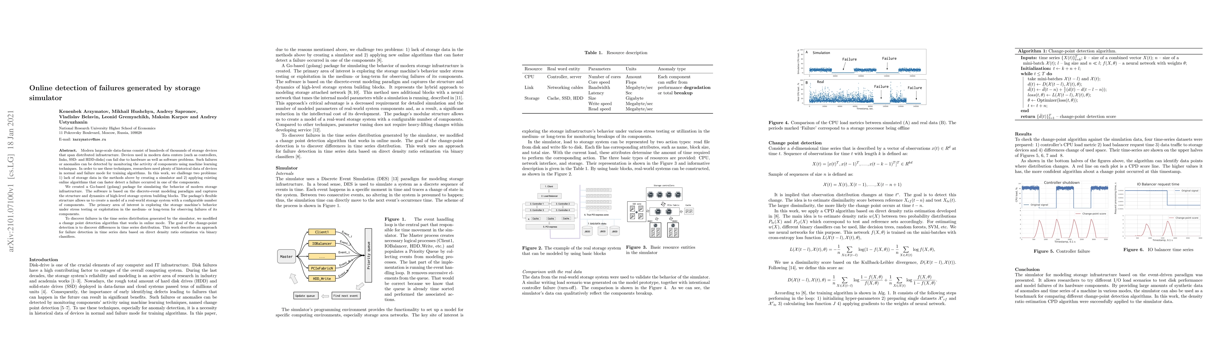 Modern large-scale data-farms consist of hundreds of thousands of storage devices that span distributed infrastructure. Devices used in modern data centers (such as controllers, links, SSD- and HDD-disks) can fail due to hardware as well as software problems. Such failures or anomalies can be detected by monitoring the activity of components using machine learning techniques. In order to use these techniques, researchers need plenty of historical data of devices in normal and failure mode for training algorithms. In this work, we challenge two problems: 1) lack of storage data in the methods above by creating a simulator and 2) applying existing online algorithms that can faster detect a failure occurred in one of the components. We created a Go-based (golang) package for simulating the behavior of modern storage infrastructure. The software is based on the discrete-event modeling paradigm and captures the structure and dynamics of high-level storage system building blocks. The package's flexible structure allows us to create a model of a real-world storage system with a configurable number of components. The primary area of interest is exploring the storage machine's behavior under stress testing or exploitation in the medium- or long-term for observing failures of its components. To discover failures in the time series distribution generated by the simulator, we modified a change point detection algorithm that works in online mode. The goal of the change-point detection is to discover differences in time series distribution. This work describes an approach for failure detection in time series data based on direct density ratio estimation via binary classifiers.