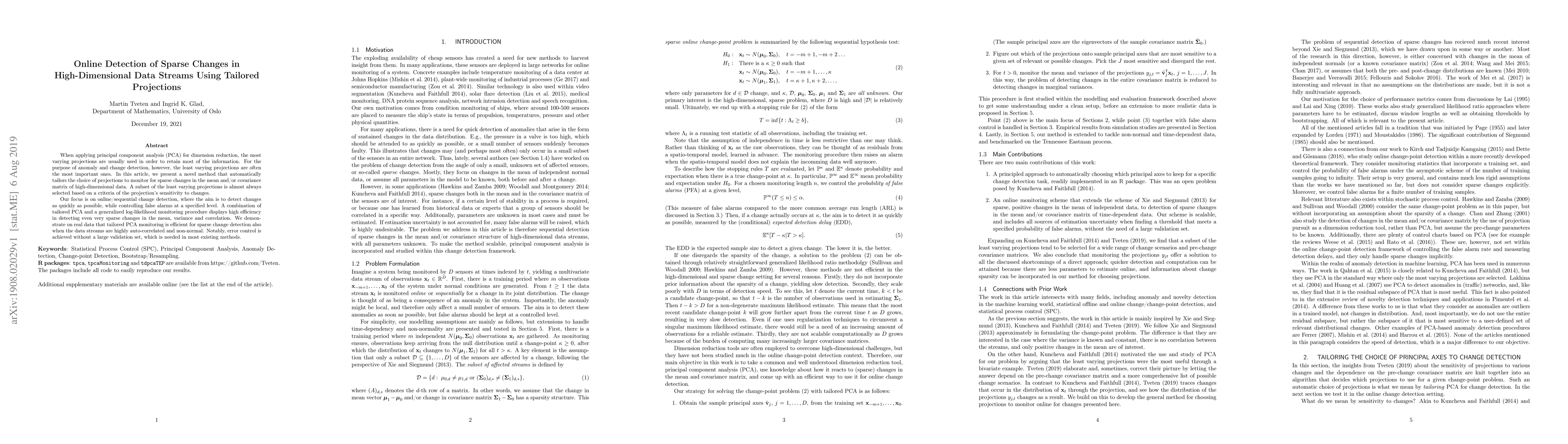 This paper introduces a novel method for online detection of sparse changes in high-dimensional data streams by tailoring PCA projections based on sensitivity to changes. The method efficiently detects sparse changes in mean, variance, and correlation using a combination of tailored PCA and a generalized log-likelihood procedure, demonstrating effectiveness even with auto-correlated and non-normal data streams without requiring a large validation set.