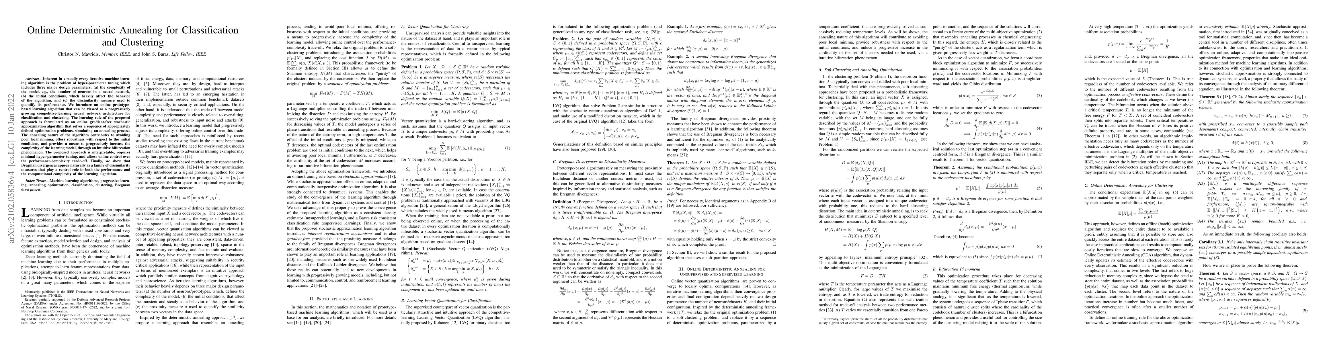 This paper introduces an online gradient-free stochastic approximation algorithm for classification and clustering, simulating an annealing process to avoid local minima and manage initial conditions. The method allows for online control over the performance-complexity trade-off and uses Bregman divergences as key dissimilarity measures.