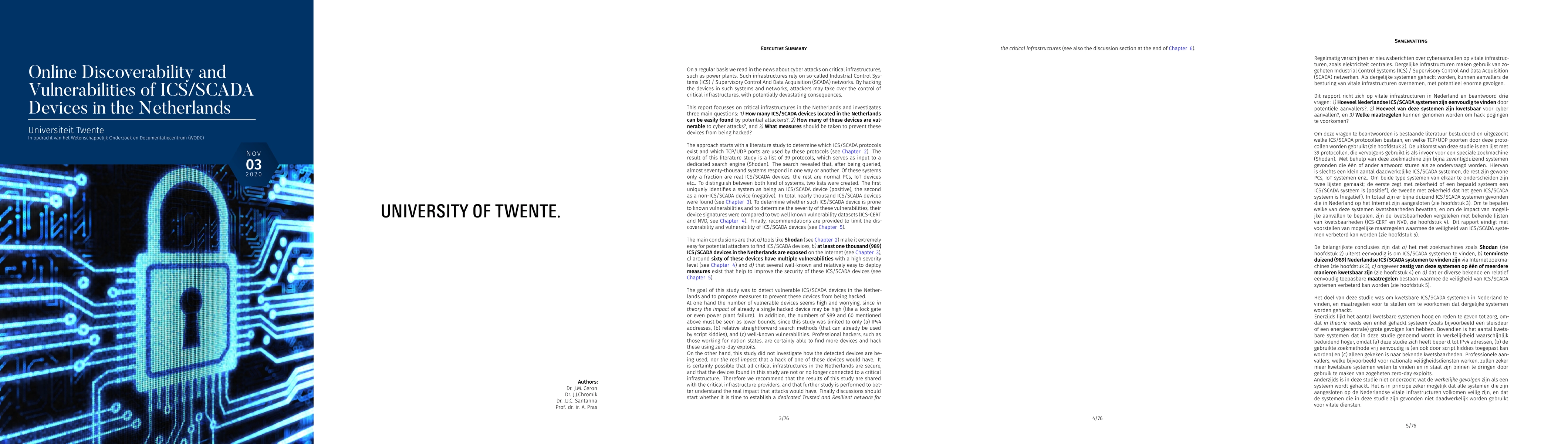 On a regular basis, we read in the news about cyber-attacks on critical infrastructures, such as power plants. Such infrastructures rely on the so-called Industrial Control Systems (ICS) / Supervisory Control And Data Acquisition (SCADA) networks. By hacking the devices in such systems and networks, attackers may take over the control of critical infrastructures, with potentially devastating consequences. This report focusses on critical infrastructures in the Netherlands and investigates three main questions: 1) How many ICS/SCADA devices located in the Netherlands can be easily found by potential attackers?, 2) How many of these devices are vulnerable to cyber-attacks?, and 3) What measures should be taken to prevent these devices from being hacked?
