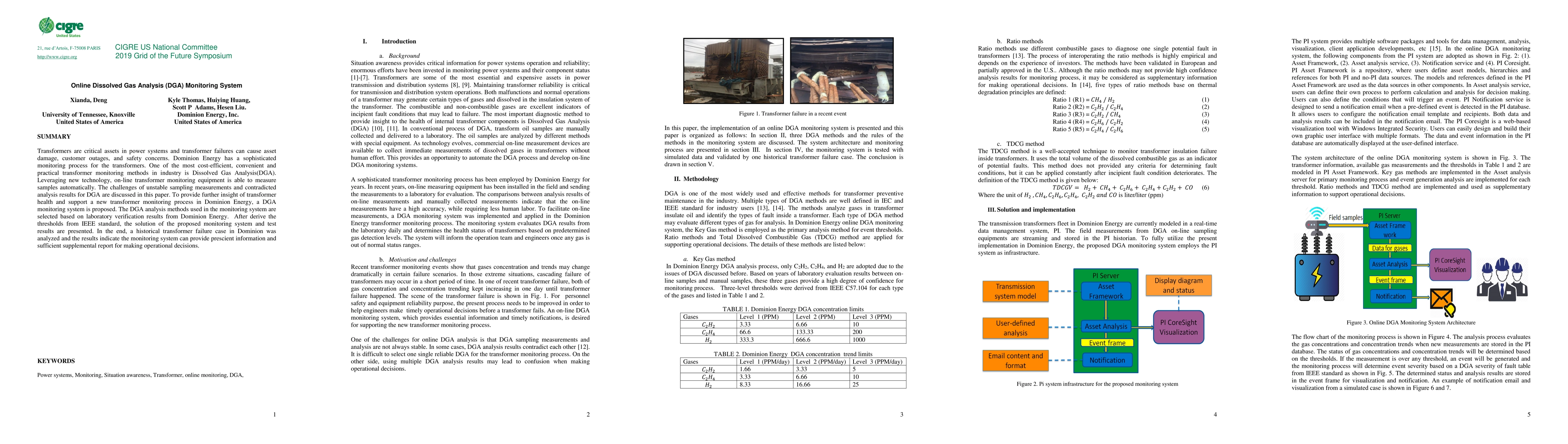 Transformers are critical assets in power systems and transformer failures can cause asset damage, customer outages, and safety concerns. Dominion Energy has a sophisticated monitoring process for the transformers. One of the most cost-efficient, convenient and practical transformer monitoring methods in industry is Dissolved Gas Analysis(DGA). Leveraging new technology, on-line transformer monitoring equipment is able to measure samples automatically. The challenges of unstable sampling measurements and contradicted analysis results for DGA are discussed in this paper. To provide further insight of transformer health and support a new transformer monitoring process in Dominion Energy, a DGA monitoring system is proposed. The DGA analysis methods used in the monitoring system are selected based on laboratory verification results from Dominion Energy. After derive the thresholds from IEEE standard, the solution of the proposed monitoring system and test results are presented. In the end, a historical transformer failure case in Dominion was analyzed and the results indicate the monitoring system can provide prescient information and sufficient supplemental report for making operational decisions.