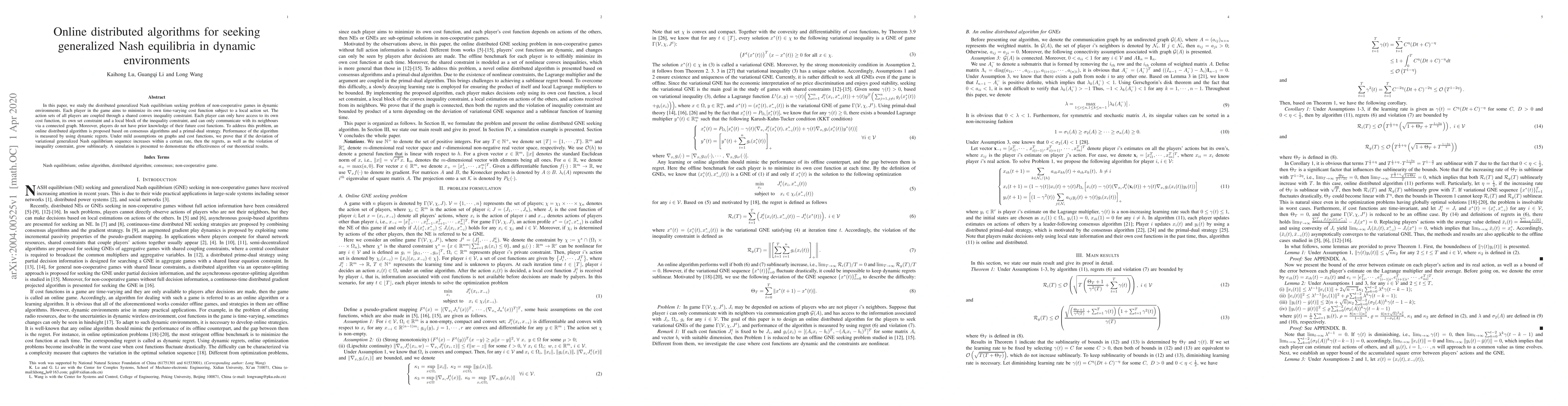 This paper proposes an online distributed algorithm for finding generalized Nash equilibria in dynamic non-cooperative games, where players minimize time-varying costs with local constraints and communicate only with neighbors. The algorithm combines consensus and primal-dual strategies, ensuring sublinear growth of regrets and constraint violations.