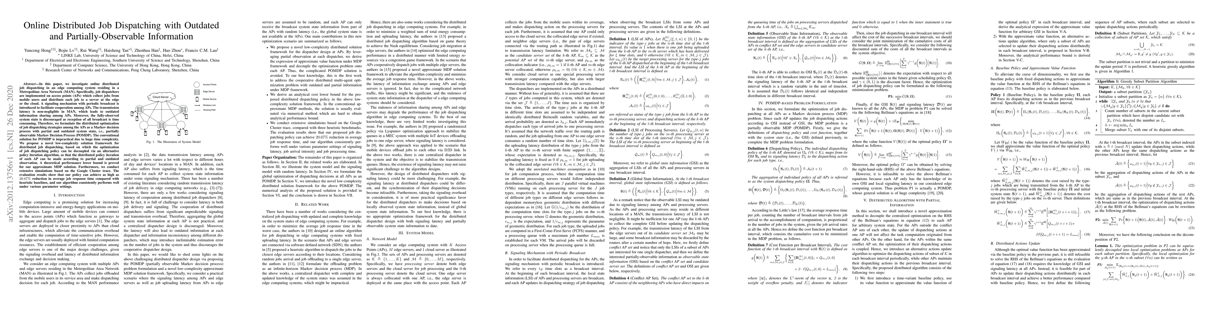In this paper, we investigate online distributed job dispatching in an edge computing system residing in a Metropolitan Area Network (MAN). Specifically, job dispatchers are implemented on access points (APs) which collect jobs from mobile users and distribute each job to a server at the edge or the cloud. A signaling mechanism with periodic broadcast is introduced to facilitate cooperation among APs. The transmission latency is non-negligible in MAN, which leads to outdated information sharing among APs. Moreover, the fully-observed system state is discouraged as reception of all broadcast is time consuming. Therefore, we formulate the distributed optimization of job dispatching strategies among the APs as a Markov decision process with partial and outdated system state, i.e., partially observable Markov Decision Process (POMDP). The conventional solution for POMDP is impractical due to huge time complexity. We propose a novel low-complexity solution framework for distributed job dispatching, based on which the optimization of job dispatching policy can be decoupled via an alternative policy iteration algorithm, so that the distributed policy iteration of each AP can be made according to partial and outdated observation. A theoretical performance lower bound is proved for our approximate MDP solution. Furthermore, we conduct extensive simulations based on the Google Cluster trace. The evaluation results show that our policy can achieve as high as $20.67\%$ reduction in average job response time compared with heuristic baselines, and our algorithm consistently performs well under various parameter settings.