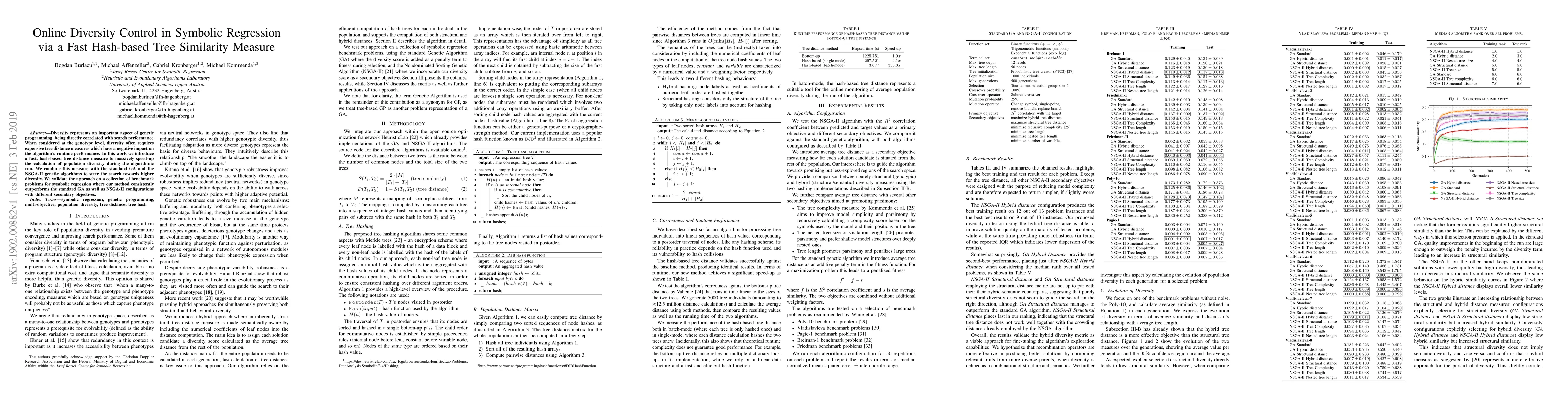 This paper proposes a fast hash-based tree similarity measure to enhance diversity in symbolic regression, significantly speeding up the calculation of population diversity. The method outperforms standard genetic algorithms and NSGA-II on benchmark symbolic regression problems.