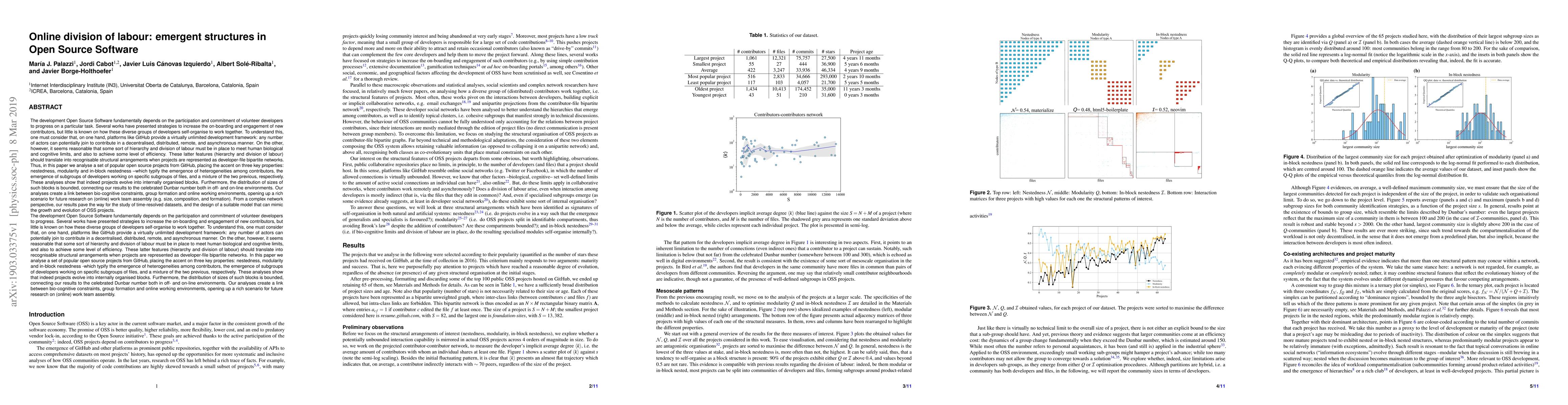The development Open Source Software fundamentally depends on the participation and commitment of volunteer developers to progress. Several works have presented strategies to increase the on-boarding and engagement of new contributors, but little is known on how these diverse groups of developers self-organise to work together. To understand this, one must consider that, on one hand, platforms like GitHub provide a virtually unlimited development framework: any number of actors can potentially join to contribute in a decentralised, distributed, remote, and asynchronous manner. On the other, however, it seems reasonable that some sort of hierarchy and division of labour must be in place to meet human biological and cognitive limits, and also to achieve some level of efficiency. These latter features (hierarchy and division of labour) should translate into recognisable structural arrangements when projects are represented as developer-file bipartite networks. In this paper we analyse a set of popular open source projects from GitHub, placing the accent on three key properties: nestedness, modularity and in-block nestedness -which typify the emergence of heterogeneities among contributors, the emergence of subgroups of developers working on specific subgroups of files, and a mixture of the two previous, respectively. These analyses show that indeed projects evolve into internally organised blocks. Furthermore, the distribution of sizes of such blocks is bounded, connecting our results to the celebrated Dunbar number both in off- and on-line environments. Our analyses create a link between bio-cognitive constraints, group formation and online working environments, opening up a rich scenario for future research on (online) work team assembly.