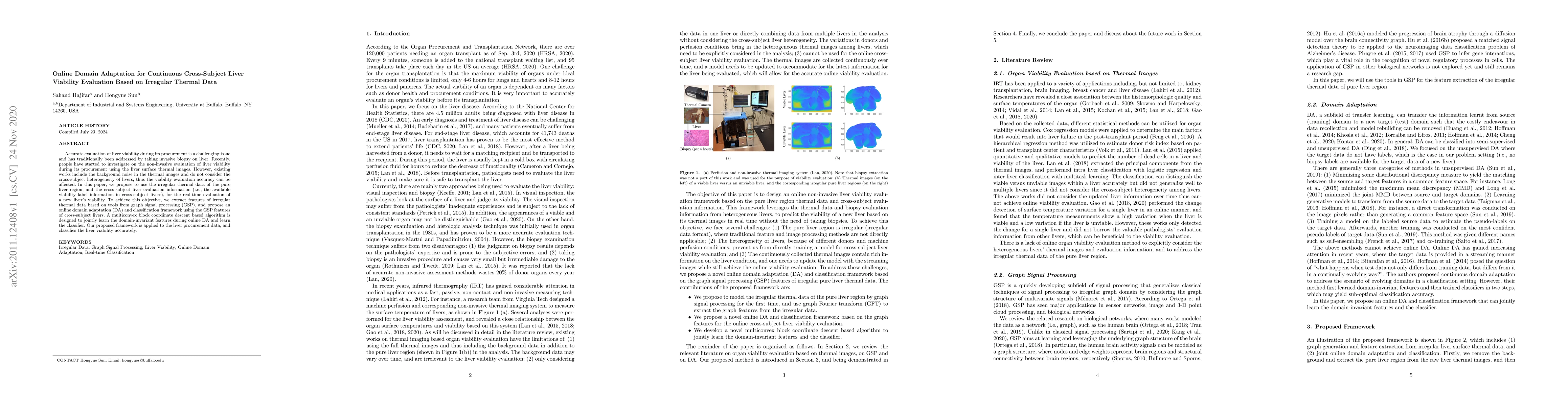 Accurate evaluation of liver viability during its procurement is a challenging issue and has traditionally been addressed by taking invasive biopsy on liver. Recently, people have started to investigate on the non-invasive evaluation of liver viability during its procurement using the liver surface thermal images. However, existing works include the background noise in the thermal images and do not consider the cross-subject heterogeneity of livers, thus the viability evaluation accuracy can be affected. In this paper, we propose to use the irregular thermal data of the pure liver region, and the cross-subject liver evaluation information (i.e., the available viability label information in cross-subject livers), for the real-time evaluation of a new liver's viability. To achieve this objective, we extract features of irregular thermal data based on tools from graph signal processing (GSP), and propose an online domain adaptation (DA) and classification framework using the GSP features of cross-subject livers. A multiconvex block coordinate descent based algorithm is designed to jointly learn the domain-invariant features during online DA and learn the classifier. Our proposed framework is applied to the liver procurement data, and classifies the liver viability accurately.