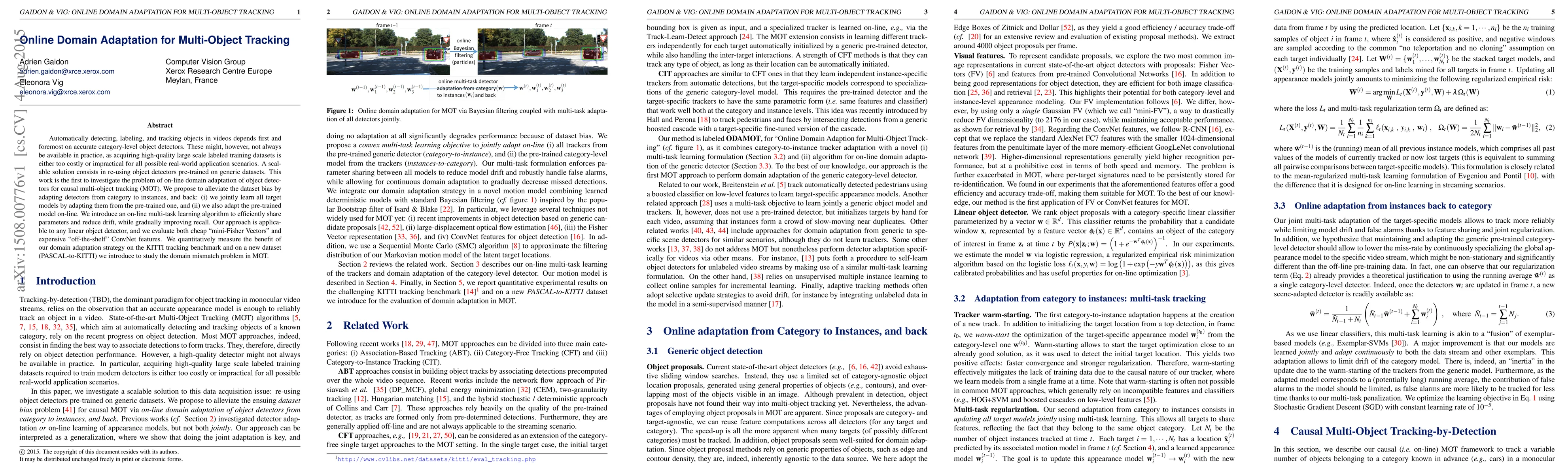 This paper proposes an online domain adaptation method to improve multi-object tracking by adapting pre-trained object detectors to new domains. The approach involves jointly learning target models and adapting the pre-trained model online, using a multi-task learning algorithm to share parameters and reduce drift, evaluated on KITTI and a new PASCAL-to-KITTI dataset.