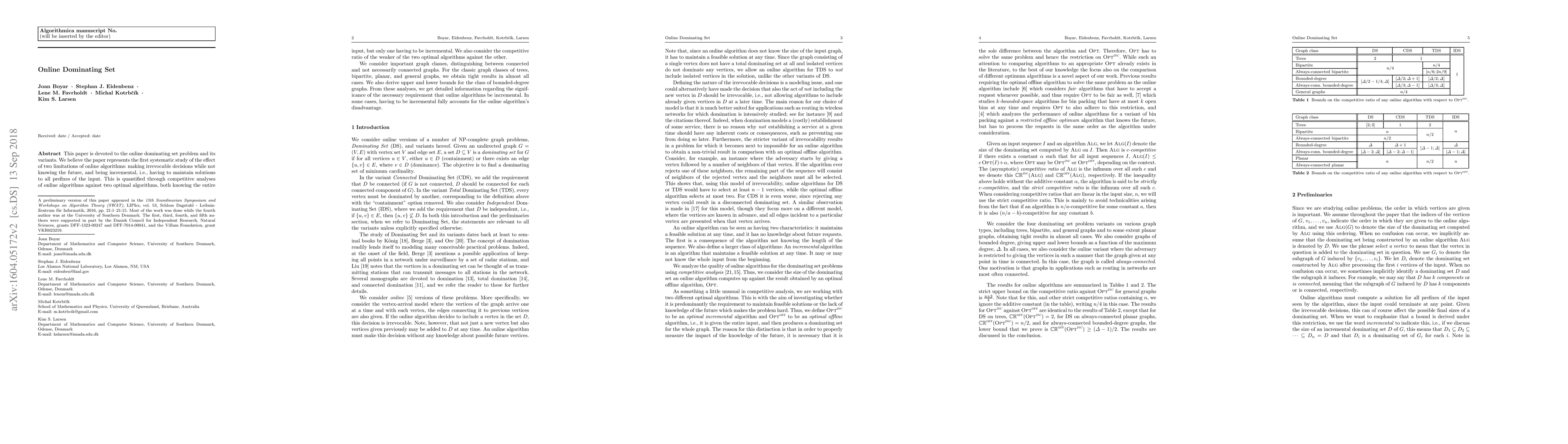 This paper systematically studies the online dominating set problem, focusing on the limitations of online algorithms. It analyzes the competitive ratio of online algorithms against optimal algorithms that know the entire input, distinguishing between incremental and non-incremental solutions. The study reveals tight results for various graph classes, highlighting the impact of the incremental requirement on online algorithm performance.