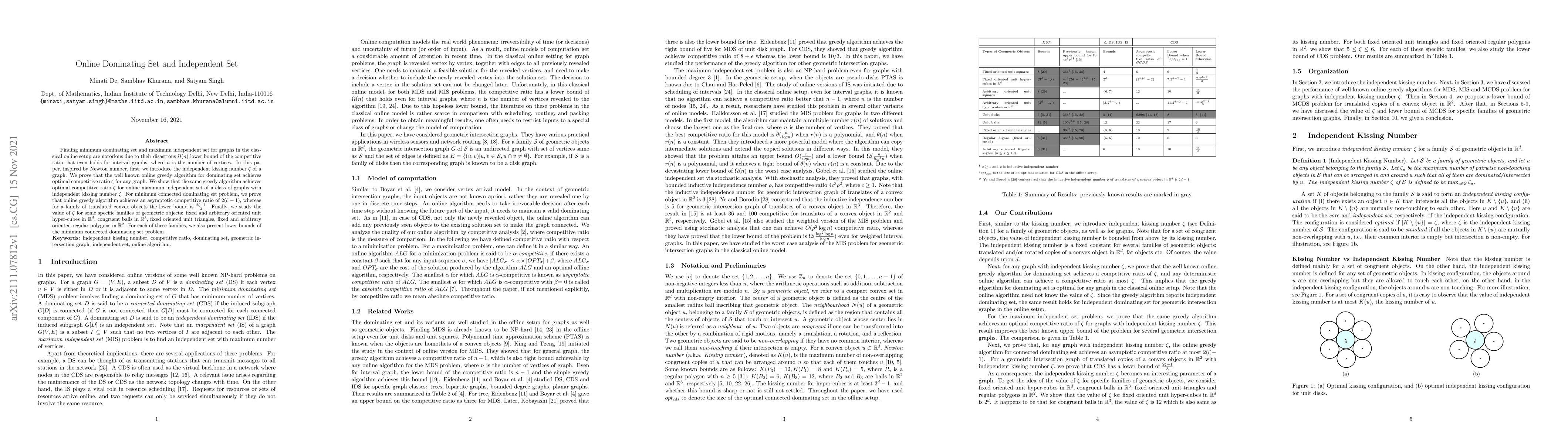 This paper explores online algorithms for finding minimum dominating sets and maximum independent sets in graphs, introducing the concept of independent kissing number $\zeta$. It proves that the greedy algorithm achieves optimal competitive ratios for dominating set and maximum independent set problems, and provides lower bounds for minimum connected dominating sets, especially for specific geometric objects.