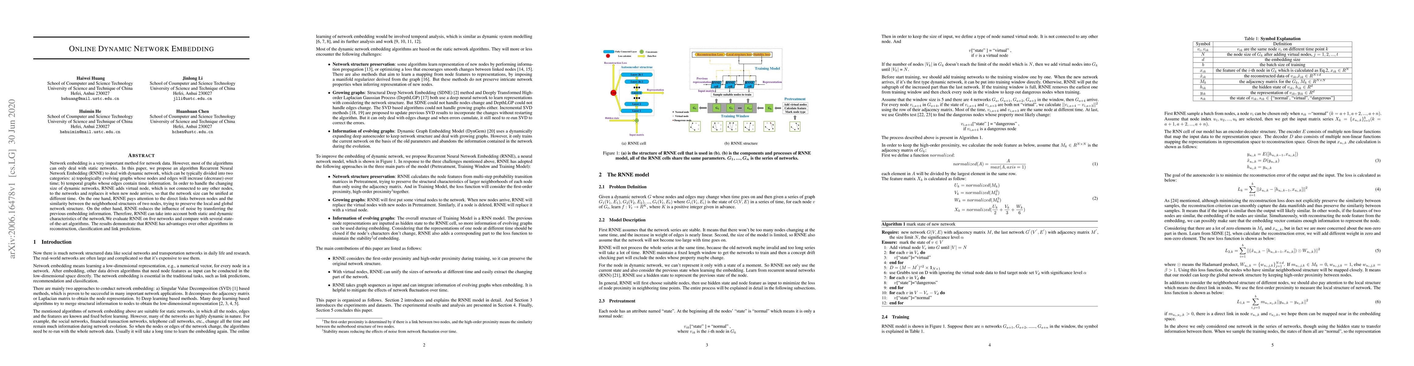 This paper introduces Recurrent Neural Network Embedding (RNNE) to handle dynamic network data, addressing both topologically evolving and temporal graphs. RNNE manages network size changes through virtual nodes and preserves network structure while reducing noise, demonstrating superior performance in reconstruction, classification, and link prediction.