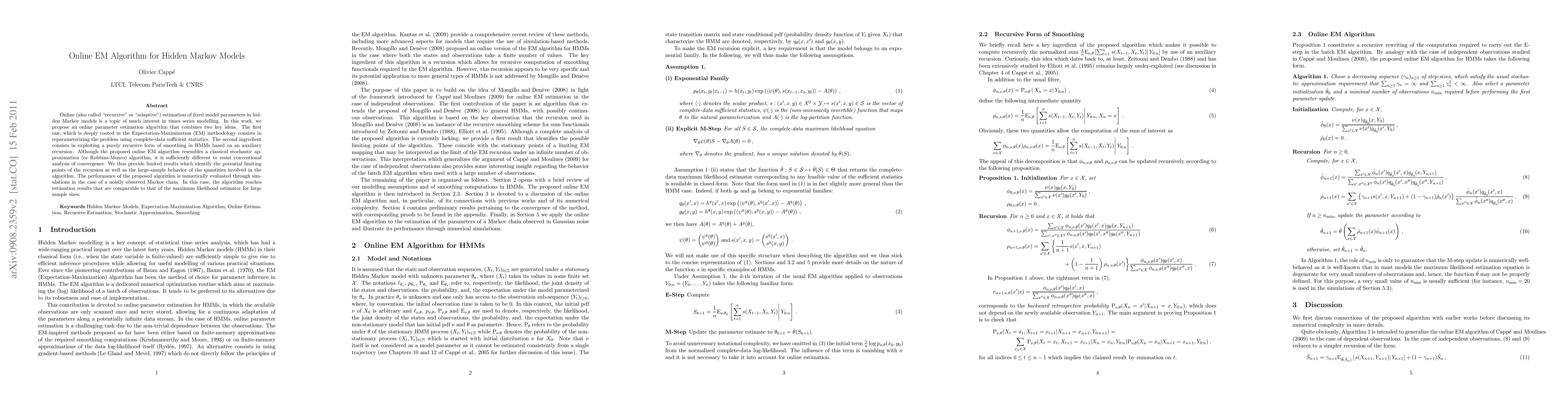 This paper proposes an online parameter estimation algorithm for hidden Markov models that combines reparameterization using complete-data sufficient statistics from the EM methodology with a recursive form of smoothing. The algorithm's performance is comparable to the maximum likelihood estimator for large sample sizes, as demonstrated through simulations.
