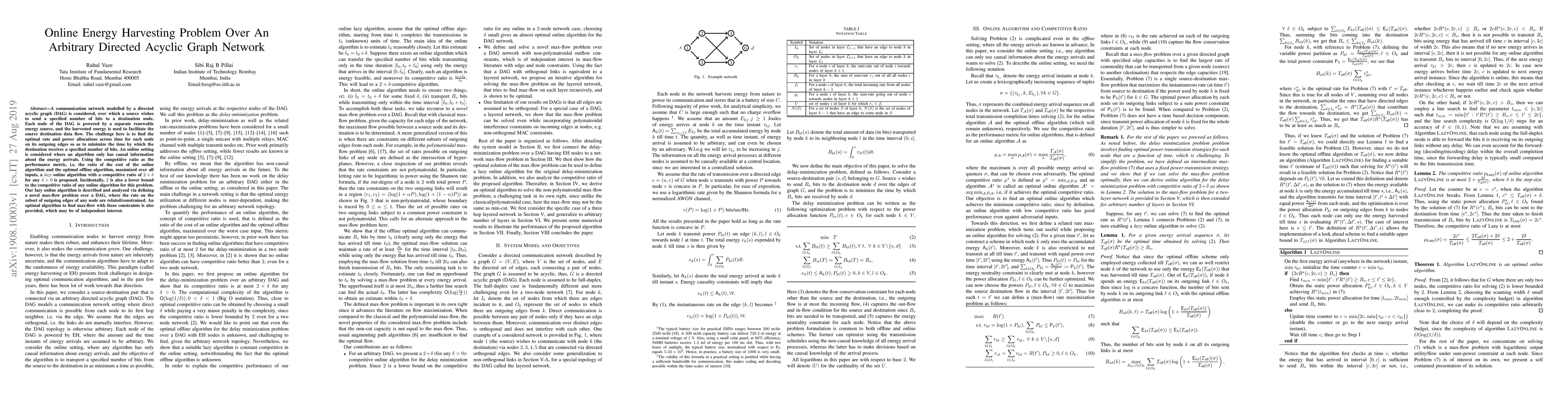 A communication network modelled by a directed acyclic graph (DAG) is considered, over which a source wishes to send a specified number of bits to a destination node. Each node of the DAG is powered by a separate renewable energy source, and the harvested energy is used to facilitate the source destination data flow. The challenge here is to find the optimal rate and power allocations across time for each node on its outgoing edges so as to minimize the time by which the destination receives a specified number of bits. An online setting is considered where an algorithm only has causal information about the energy arrivals. Using the competitive ratio as the performance metric, i.e. the ratio of the cost of the online algorithm and the optimal offline algorithm, maximized over all inputs, a {\it lazy} online algorithm with a competitive ratio of $2+\delta$ for any $\delta>0$ is proposed. Incidentally, $2$ is also a lower bound to the competitive ratio of any online algorithm for this problem. Our lazy online algorithm is described and analyzed via defining a novel max-flow problem over a DAG, where the rate on the subset of outgoing edges of any node are related/constrained. An optimal algorithm to find max-flow with these constraints is also provided, which may be of independent interest.