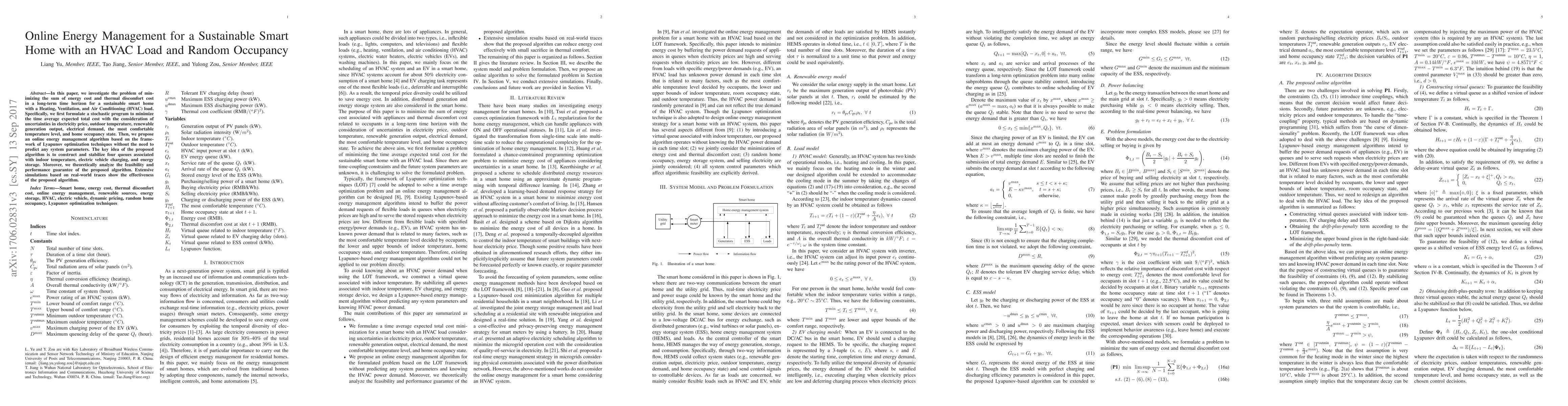 This paper proposes an online energy management algorithm for a sustainable smart home with HVAC, aiming to minimize energy and thermal discomfort costs over a long-term horizon. The algorithm leverages Lyapunov optimization to manage uncertainties without parameter predictions, stabilizing queues for indoor temperature and energy storage.