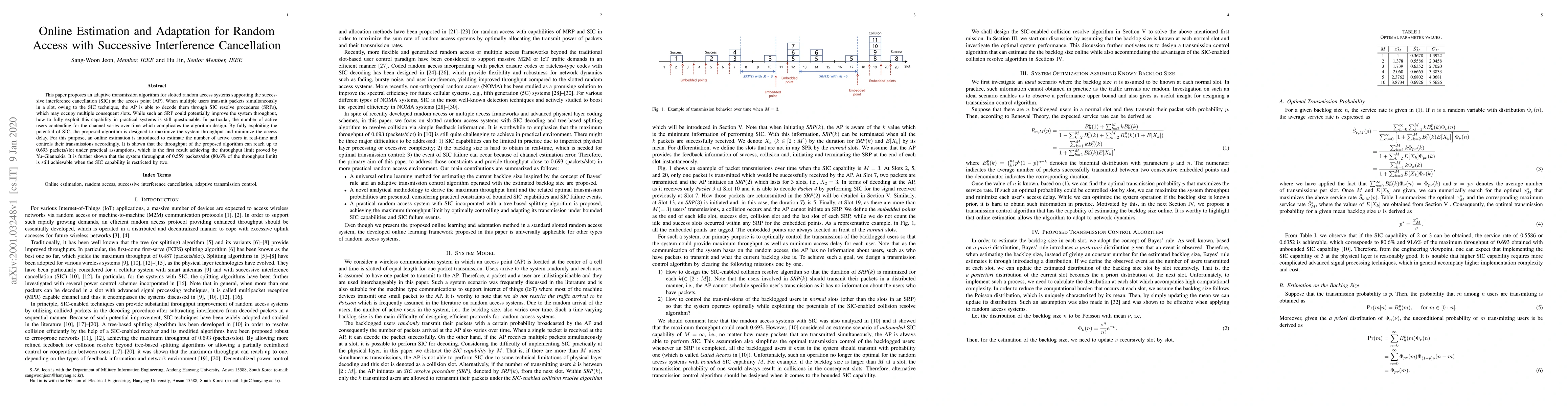 A new transmission algorithm for slotted random access systems with successive interference cancellation (SIC) achieves up to 0.693 packets/slot in throughput, surpassing the theoretical limit.
