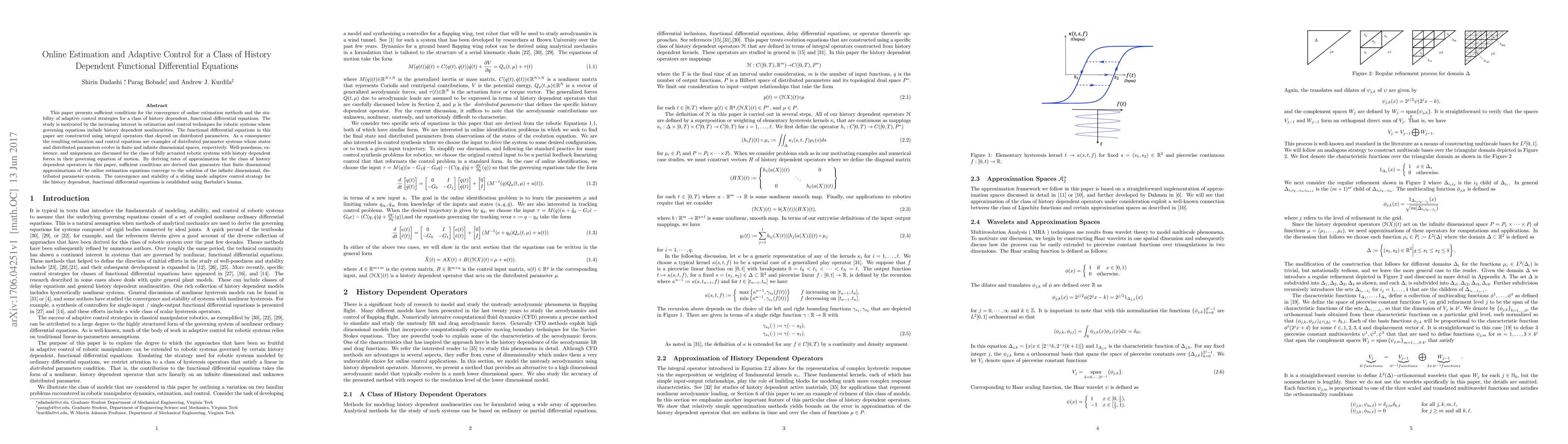 This paper presents sufficient conditions for the convergence of online estimation methods and the stability of adaptive control strategies for a class of history dependent, functional differential equations. The study is motivated by the increasing interest in estimation and control techniques for robotic systems whose governing equations include history dependent nonlinearities. The functional differential equations in this paper are constructed using integral operators that depend on distributed parameters. As a consequence the resulting estimation and control equations are examples of distributed parameter systems whose states and distributed parameters evolve in finite and infinite dimensional spaces, respectively. suWell-posedness, existence, and uniqueness are discussed for the class of fully actuated robotic systems with history dependent forces in their governing equation of motion. By deriving rates of approximation for the class of history dependent operators in this paper, sufficient conditions are derived that guarantee that finite dimensional approximations of the online estimation equations converge to the solution of the infinite dimensional, distributed parameter system. The convergence and stability of a sliding mode adaptive control strategy for the history dependent, functional differential equations is established using Barbalat's lemma.