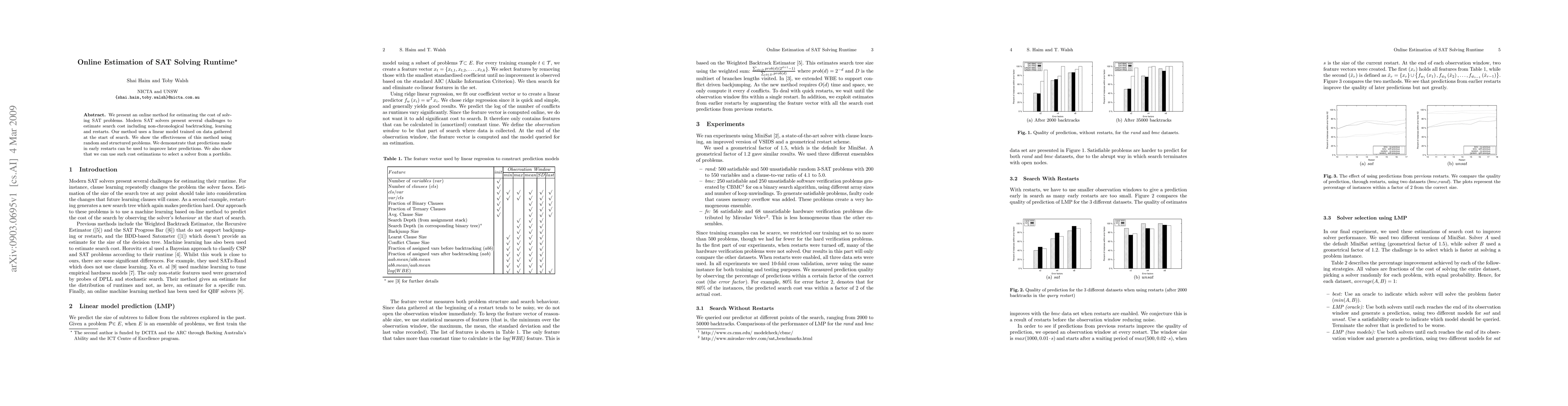 This research introduces an online method for estimating the runtime of SAT solvers using a linear model trained on initial search data. The method effectively predicts search costs, improves predictions through early restarts, and aids in solver selection from a portfolio.