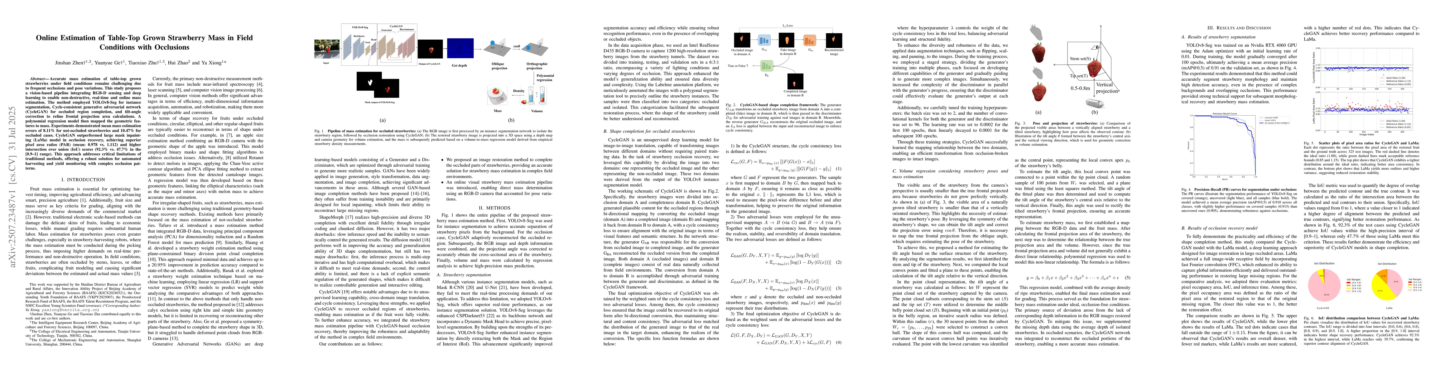Accurate mass estimation of table-top grown strawberries under field conditions remains challenging due to frequent occlusions and pose variations. This study proposes a vision-based pipeline integrating RGB-D sensing and deep learning to enable non-destructive, real-time and online mass estimation. The method employed YOLOv8-Seg for instance segmentation, Cycle-consistent generative adversarial network (CycleGAN) for occluded region completion, and tilt-angle correction to refine frontal projection area calculations. A polynomial regression model then mapped the geometric features to mass. Experiments demonstrated mean mass estimation errors of 8.11% for isolated strawberries and 10.47% for occluded cases. CycleGAN outperformed large mask inpainting (LaMa) model in occlusion recovery, achieving superior pixel area ratios (PAR) (mean: 0.978 vs. 1.112) and higher intersection over union (IoU) scores (92.3% vs. 47.7% in the [0.9-1] range). This approach addresses critical limitations of traditional methods, offering a robust solution for automated harvesting and yield monitoring with complex occlusion patterns.