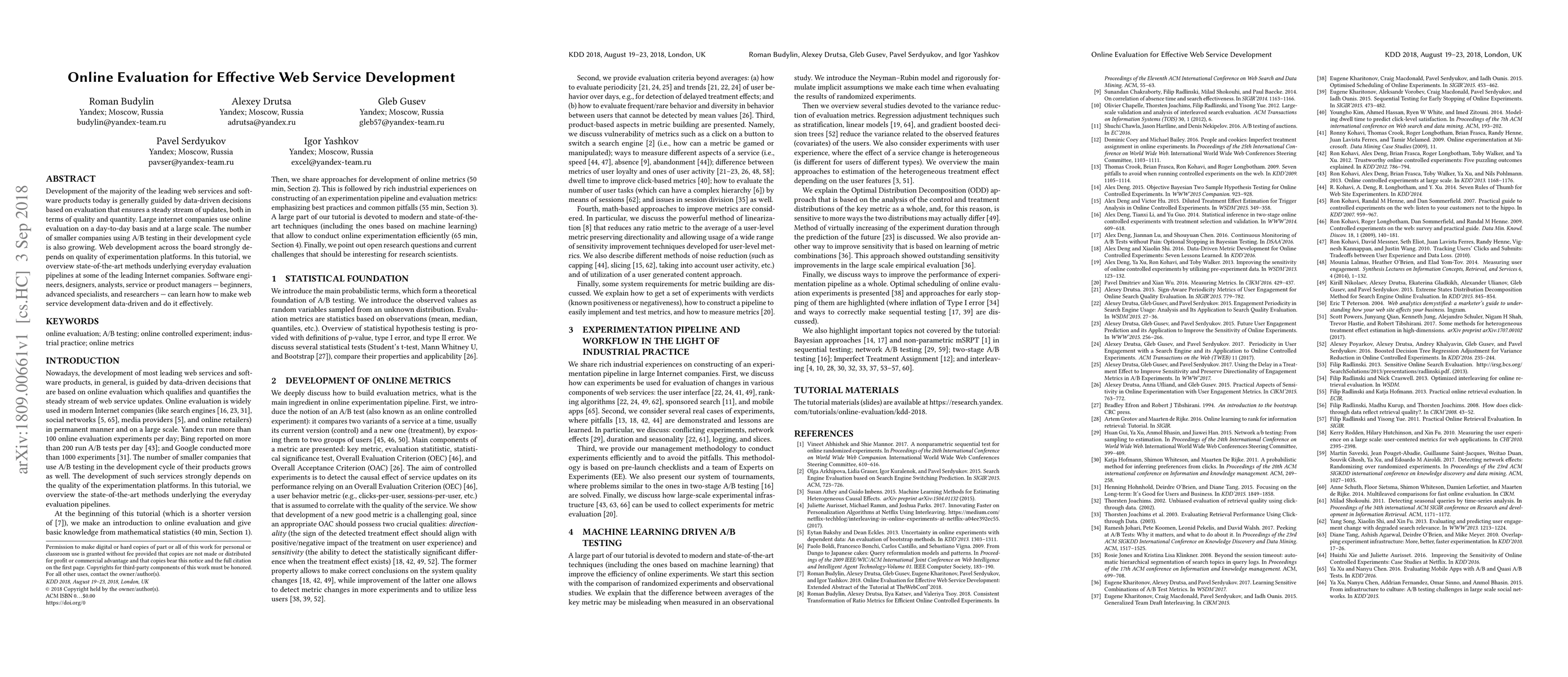 Development of the majority of the leading web services and software products today is generally guided by data-driven decisions based on evaluation that ensures a steady stream of updates, both in terms of quality and quantity. Large internet companies use online evaluation on a day-to-day basis and at a large scale. The number of smaller companies using A/B testing in their development cycle is also growing. Web development across the board strongly depends on quality of experimentation platforms. In this tutorial, we overview state-of-the-art methods underlying everyday evaluation pipelines at some of the leading Internet companies. Software engineers, designers, analysts, service or product managers --- beginners, advanced specialists, and researchers --- can learn how to make web service development data-driven and do it effectively.