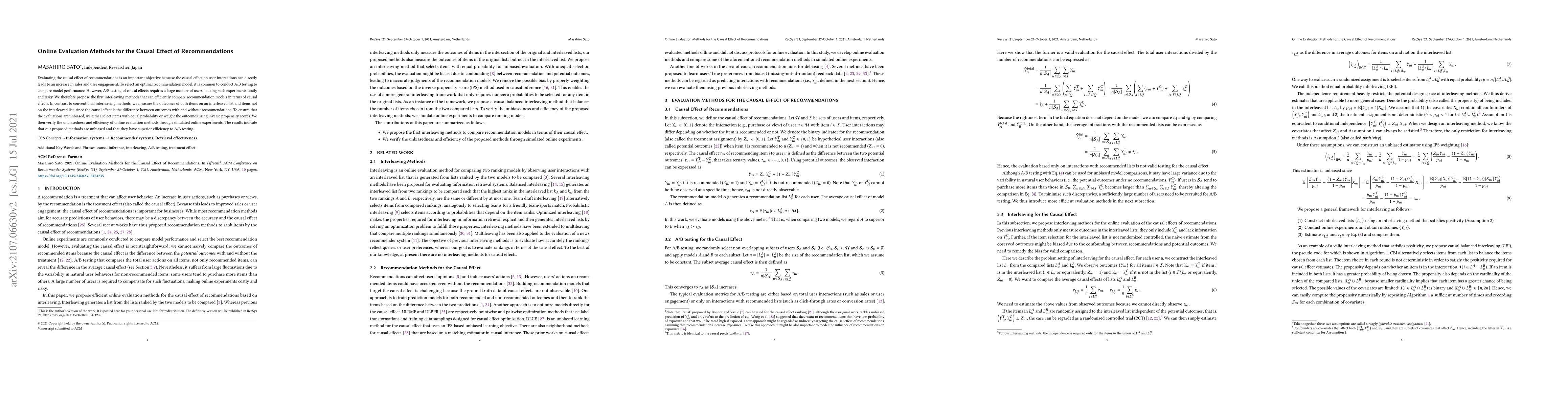 Researchers proposed online evaluation methods to compare recommendation models' causal effects without requiring large user groups, finding them unbiased and more efficient than traditional A/B testing.
