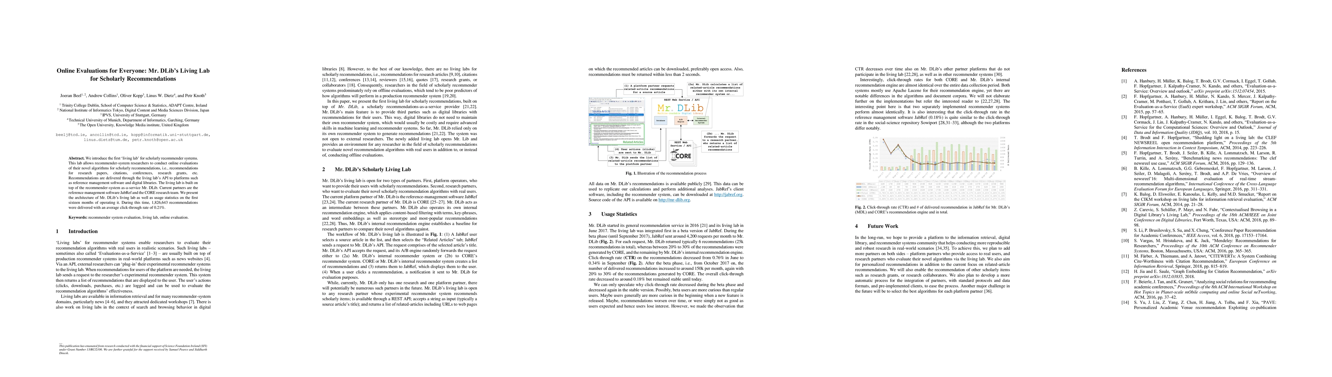 This paper introduces Mr. DLib's living lab, a platform for evaluating scholarly recommender systems, enabling researchers to test algorithms for recommending research papers, citations, and more. The lab delivered over 1.8 million recommendations in its first sixteen months, with an average click-through rate of 0.21%.