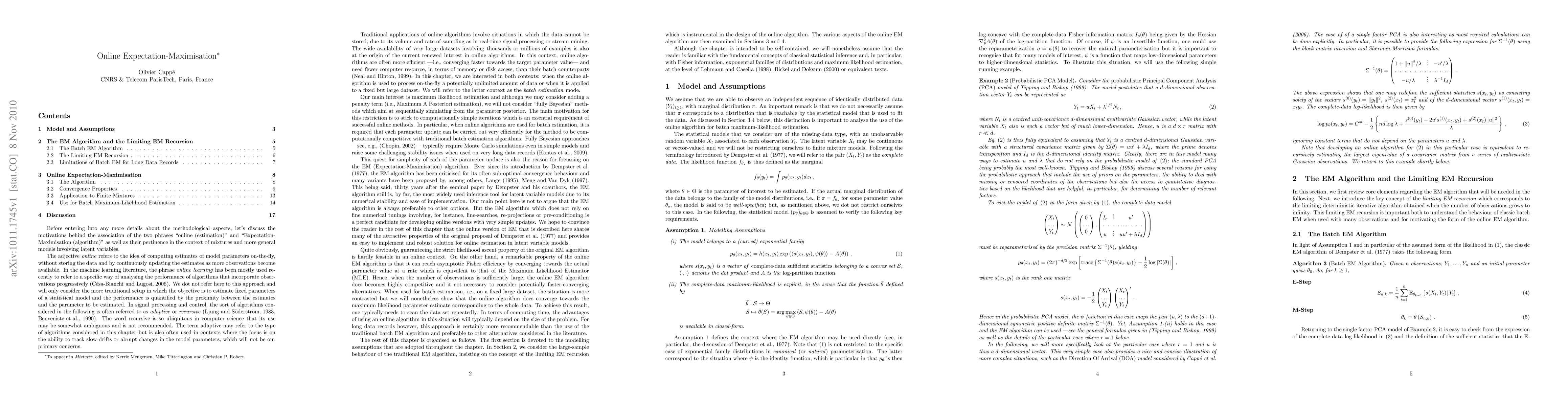 Tutorial chapter on the Online EM algorithm to appear in the volume 'Mixtures' edited by Kerrie Mengersen, Mike Titterington and Christian P. Robert.