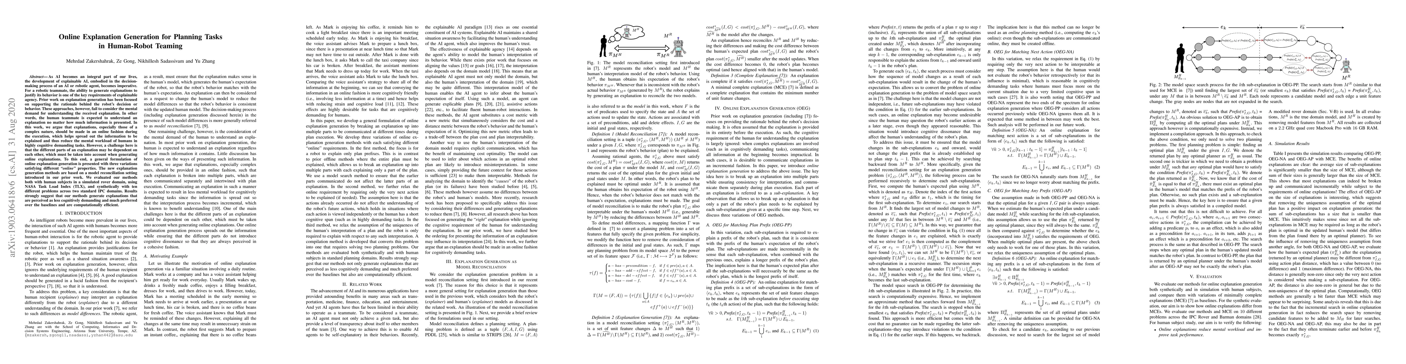 As AI becomes an integral part of our lives, the development of explainable AI, embodied in the decision-making process of an AI or robotic agent, becomes imperative. For a robotic teammate, the ability to generate explanations to justify its behavior is one of the key requirements of explainable agency. Prior work on explanation generation has been focused on supporting the rationale behind the robot's decision or behavior. These approaches, however, fail to consider the mental demand for understanding the received explanation. In other words, the human teammate is expected to understand an explanation no matter how much information is presented. In this work, we argue that explanations, especially those of a complex nature, should be made in an online fashion during the execution, which helps spread out the information to be explained and thus reduce the mental workload of humans in highly cognitive demanding tasks. However, a challenge here is that the different parts of an explanation may be dependent on each other, which must be taken into account when generating online explanations. To this end, a general formulation of online explanation generation is presented with three variations satisfying different "online" properties. The new explanation generation methods are based on a model reconciliation setting introduced in our prior work. We evaluated our methods both with human subjects in a simulated rover domain, using NASA Task Load Index (TLX), and synthetically with ten different problems across two standard IPC domains. Results strongly suggest that our methods generate explanations that are perceived as less cognitively demanding and much preferred over the baselines and are computationally efficient.