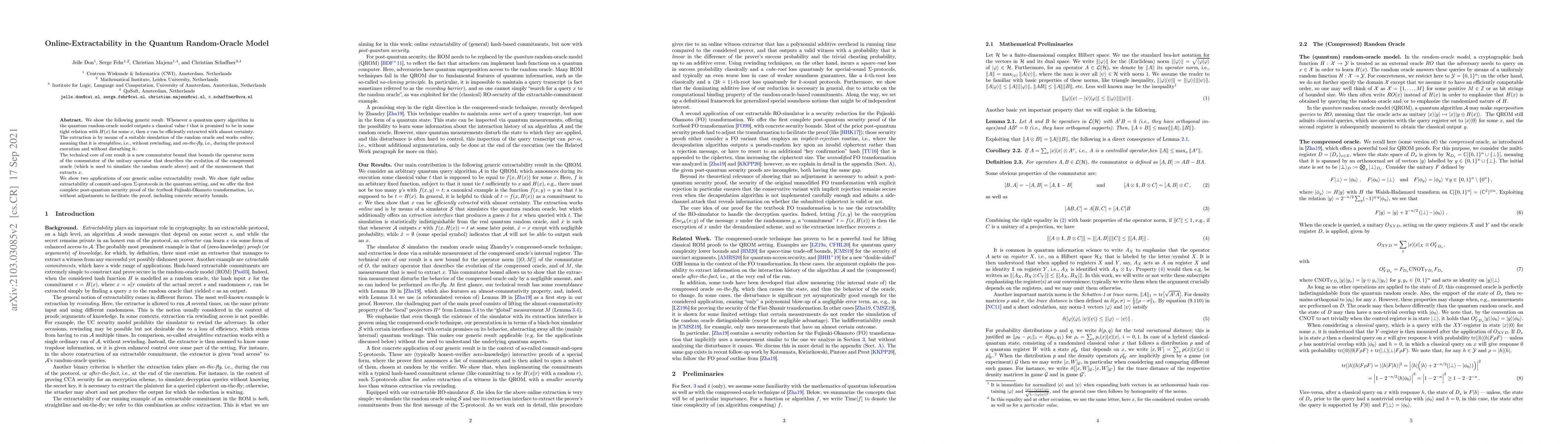 This paper demonstrates a generic online extractability result in the quantum random-oracle model, showing that any quantum algorithm outputting a value related to a hash can be efficiently extracted without rewinding. The core technical contribution is a new commutator bound for the evolution of the compressed oracle.