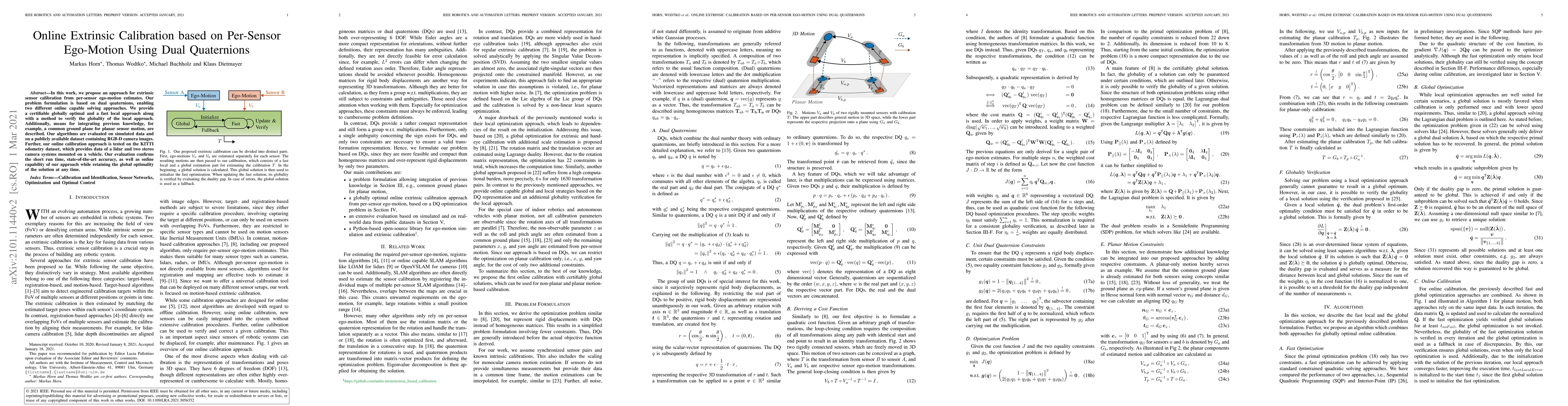 This paper proposes an online extrinsic sensor calibration method using dual quaternions for per-sensor ego-motion, offering both a globally optimal and a fast local approach. The evaluation on simulated and real datasets, including the KITTI odometry dataset, demonstrates the method's short runtime, high accuracy, and online calibration capability.