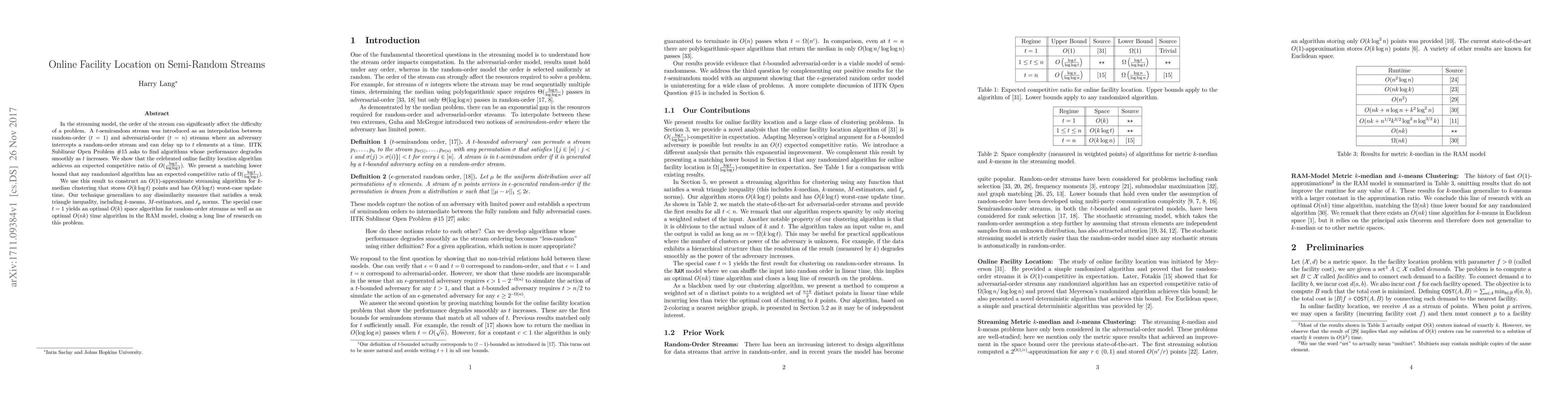 In the streaming model, the order of the stream can significantly affect the difficulty of a problem. A $t$-semirandom stream was introduced as an interpolation between random-order ($t=1$) and adversarial-order ($t=n$) streams where an adversary intercepts a random-order stream and can delay up to $t$ elements at a time. IITK Sublinear Open Problem \#15 asks to find algorithms whose performance degrades smoothly as $t$ increases. We show that the celebrated online facility location algorithm achieves an expected competitive ratio of $O(\frac{\log t}{\log \log t})$. We present a matching lower bound that any randomized algorithm has an expected competitive ratio of $\Omega(\frac{\log t}{\log \log t})$. We use this result to construct an $O(1)$-approximate streaming algorithm for $k$-median clustering that stores $O(k \log t)$ points and has $O(k \log t)$ worst-case update time. Our technique generalizes to any dissimilarity measure that satisfies a weak triangle inequality, including $k$-means, $M$-estimators, and $\ell_p$ norms. The special case $t=1$ yields an optimal $O(k)$ space algorithm for random-order streams as well as an optimal $O(nk)$ time algorithm in the RAM model, closing a long line of research on this problem.