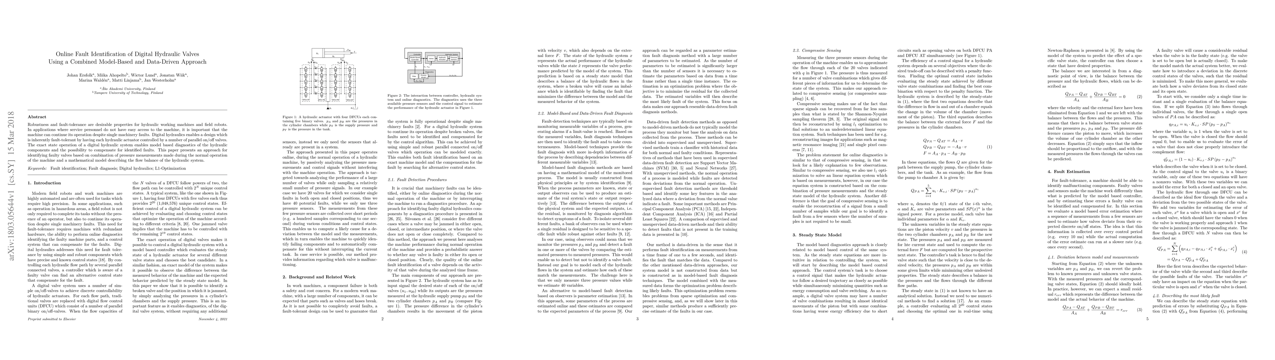Robustness and fault-tolerance are desirable properties for hydraulic working machines and field robots. In applications where service personnel do not have easy access to the machine, it is important that the machine can continue its operation despite single machinery faults. Digital hydraulics enables a design which is inherently fault-tolerant by having each hydraulic actuator controlled by a number of parallel on/off valves. The exact state operation of a digital hydraulic system enables model based diagnostics of the hydraulic components and the possibility to compensate for identified faults. This paper presents an approach for identifying faulty valves based on combination of pressure measurements made during the normal operation of the machine and a mathematical model describing the flow balance of the hydraulic system.
