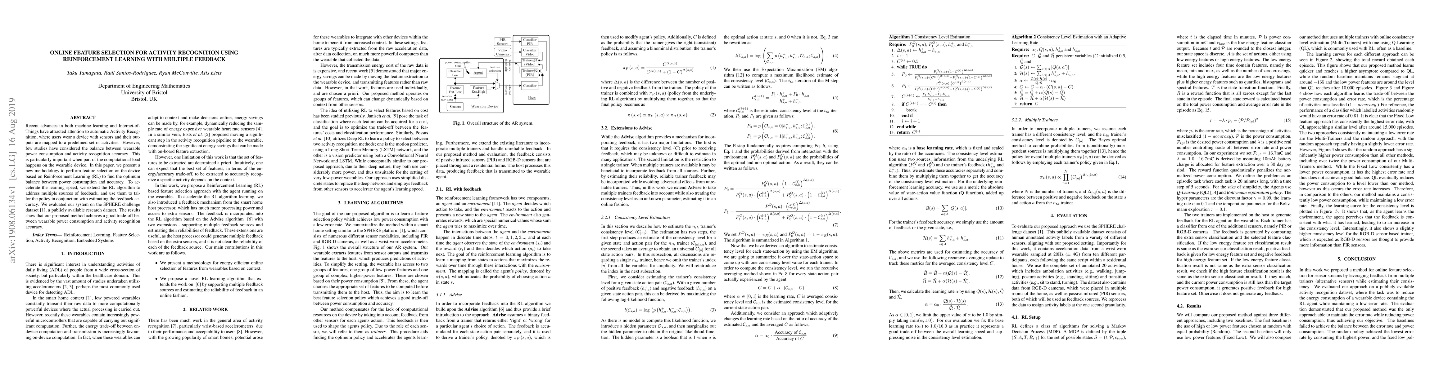 Recent advances in both machine learning and Internet-of-Things have attracted attention to automatic Activity Recognition, where users wear a device with sensors and their outputs are mapped to a predefined set of activities. However, few studies have considered the balance between wearable power consumption and activity recognition accuracy. This is particularly important when part of the computational load happens on the wearable device. In this paper, we present a new methodology to perform feature selection on the device based on Reinforcement Learning (RL) to find the optimum balance between power consumption and accuracy. To accelerate the learning speed, we extend the RL algorithm to address multiple sources of feedback, and use them to tailor the policy in conjunction with estimating the feedback accuracy. We evaluated our system on the SPHERE challenge dataset, a publicly available research dataset. The results show that our proposed method achieves a good trade-off between wearable power consumption and activity recognition accuracy.