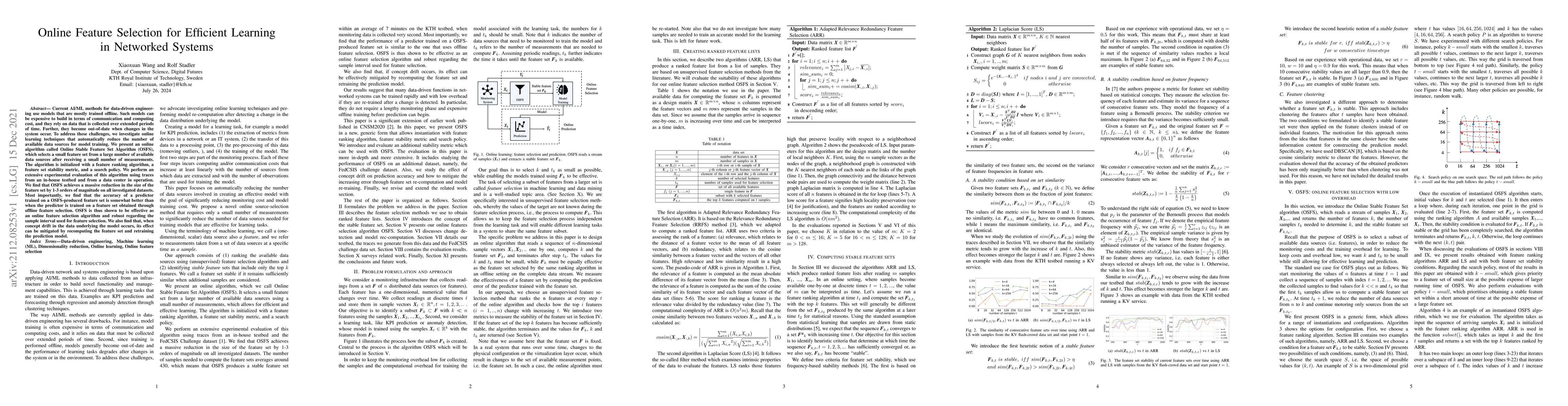 This paper proposes an online feature selection algorithm, OSFS, to reduce the number of data sources for model training in networked systems, achieving significant feature set size reduction and maintaining or improving prediction accuracy compared to offline methods. The algorithm is shown to be robust and effective in adapting to concept drift through periodic recomputation.