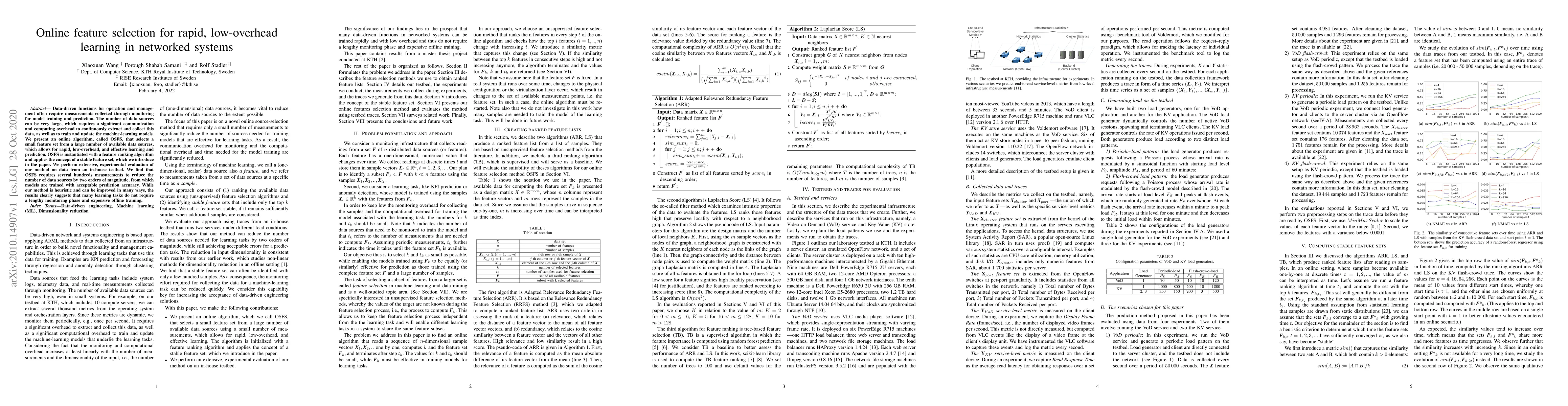 Data-driven functions for operation and management often require measurements collected through monitoring for model training and prediction. The number of data sources can be very large, which requires a significant communication and computing overhead to continuously extract and collect this data, as well as to train and update the machine-learning models. We present an online algorithm, called OSFS, that selects a small feature set from a large number of available data sources, which allows for rapid, low-overhead, and effective learning and prediction. OSFS is instantiated with a feature ranking algorithm and applies the concept of a stable feature set, which we introduce in the paper. We perform extensive, experimental evaluation of our method on data from an in-house testbed. We find that OSFS requires several hundreds measurements to reduce the number of data sources by two orders of magnitude, from which models are trained with acceptable prediction accuracy. While our method is heuristic and can be improved in many ways, the results clearly suggests that many learning tasks do not require a lengthy monitoring phase and expensive offline training.