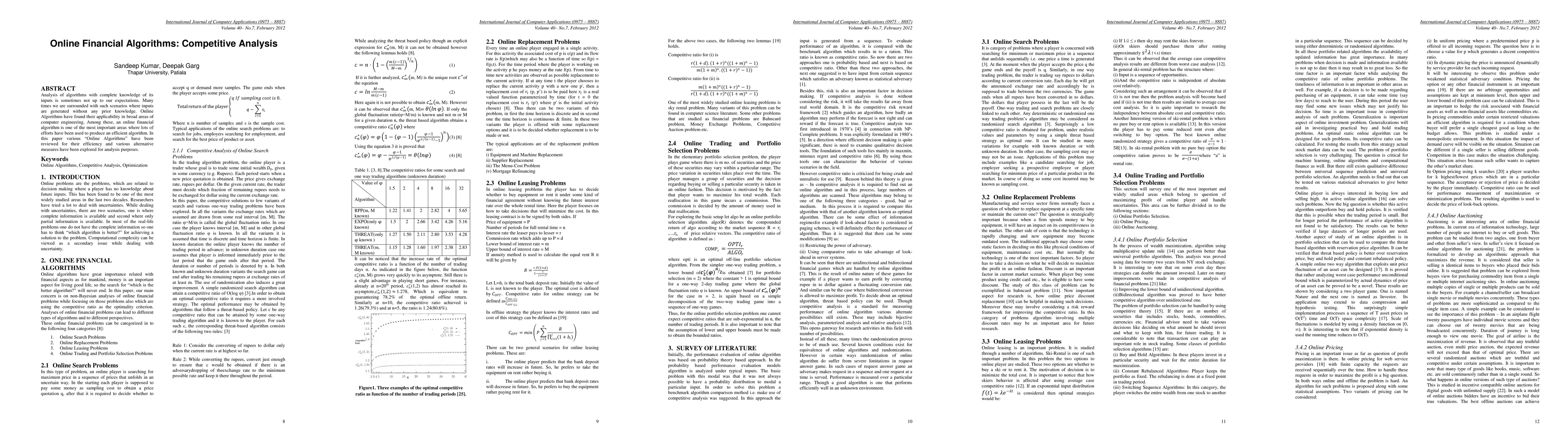 Analysis of algorithms with complete knowledge of its inputs is sometimes not up to our expectations. Many times we are surrounded with such scenarios where inputs are generated without any prior knowledge. Online Algorithms have found their applicability in broad areas of computer engineering. Among these, an online financial algorithm is one of the most important areas where lots of efforts have been used to produce an efficient algorithm. In this paper various Online Algorithms have been reviewed for their efficiency and various alternative measures have been explored for analysis purposes.