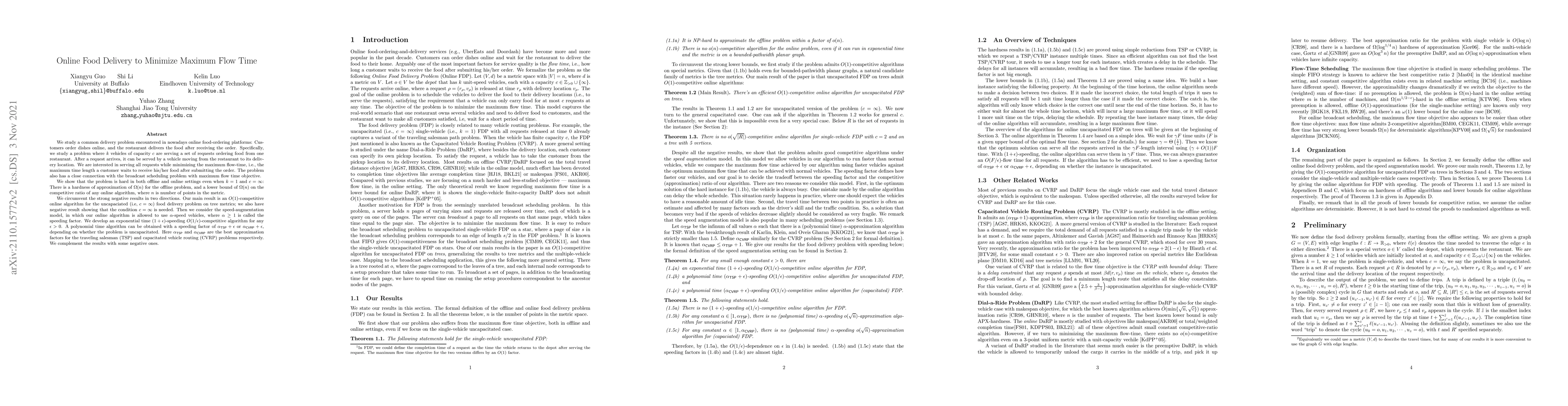 This paper investigates the optimization problem of minimizing maximum flow time in online food delivery systems using $k$ delivery vehicles. It demonstrates the problem's computational complexity and presents an $O(1)$-competitive online algorithm for uncapacitated deliveries on tree metrics, along with exponential and polynomial time algorithms for speed-augmentation models.