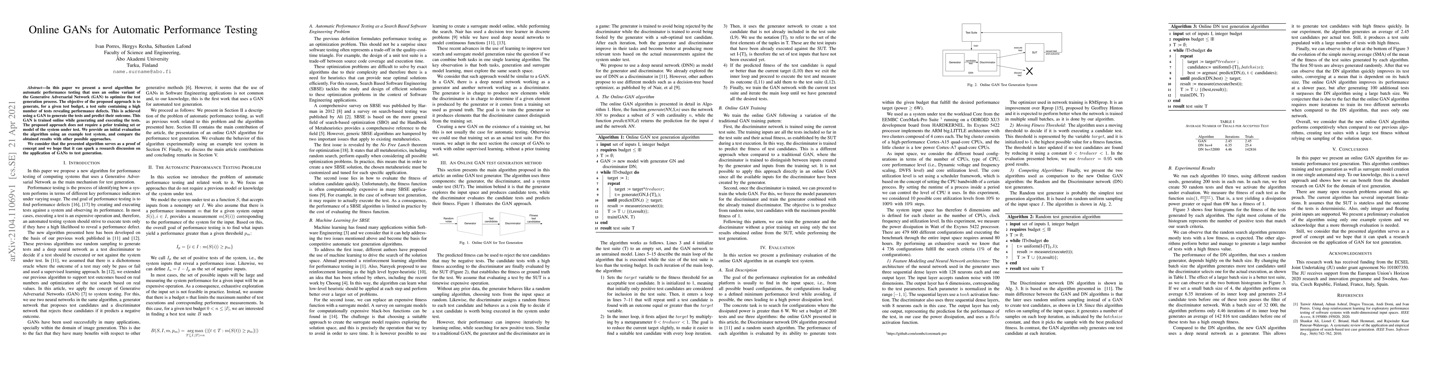 This paper introduces an online GAN-based algorithm for automatic performance testing, optimizing test generation to reveal performance defects without requiring a pre-trained model or training set. Initial evaluation shows promising results compared to other methods.