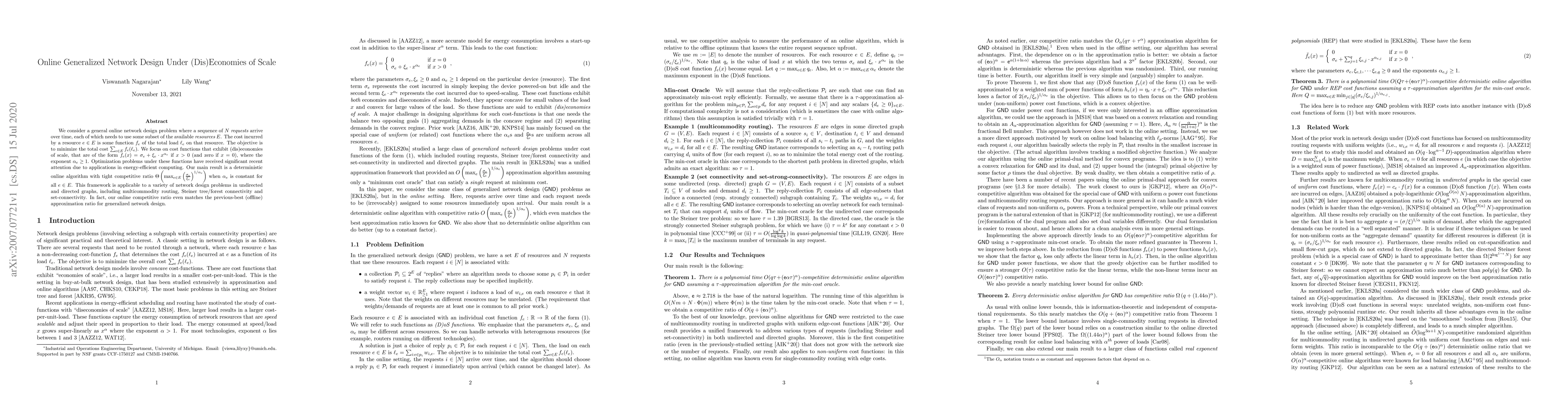 We consider a general online network design problem where a sequence of N requests arrive over time, each of which needs to use some subset of the available resources E. The cost incurred by any resource e is some function $f_e$ of the total load $L_e$ on that resource. The objective is to minimize the total cost $\sum_{e\in E} f_e(L_e)$. We focus on cost functions that exhibit (dis)economies of scale, that are of the form $f_e(x) = \sigma_e + \xi_e\cdot x^{\alpha_e}$ if $x>0$ (and zero if $x=0$), where the exponent $\alpha_e\ge 1$. Optimization problems under these functions have received significant recent attention due to applications in energy-efficient computing. Our main result is a deterministic online algorithm with tight competitive ratio $\Theta\left(\max_{e\in E} \left(\frac{\sigma_e}{\xi_e}\right)^{1/\alpha_e}\right)$ when $\alpha_e$ is constant for all $e\in E$. This framework is applicable to a variety of network design problems in undirected and directed graphs, including multicommodity routing, Steiner tree/forest connectivity and set-connectivity. In fact, our online competitive ratio even matches the previous-best (offline) approximation ratio for generalized network design.