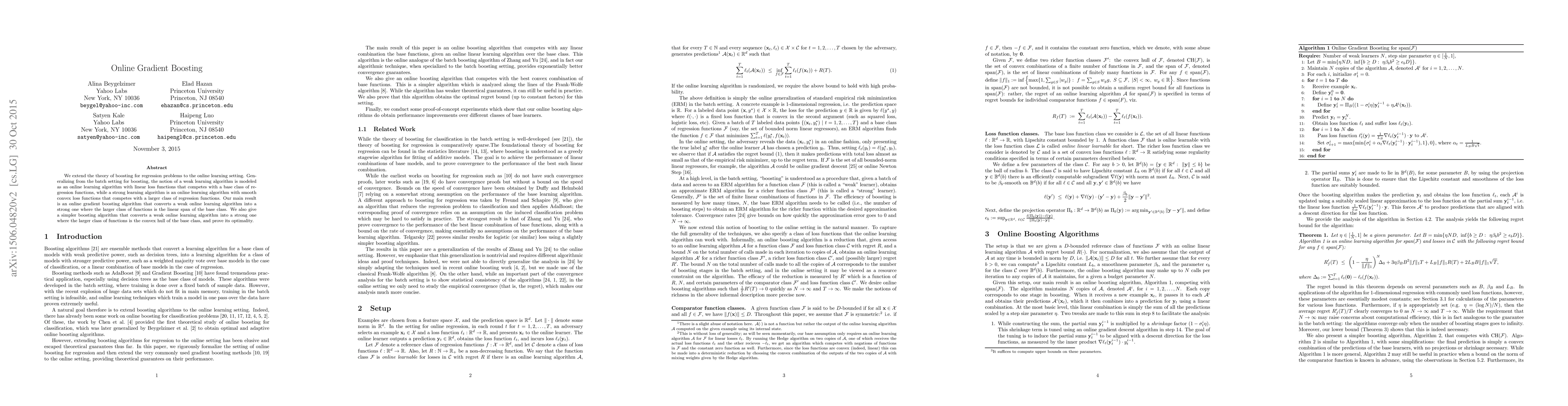 This paper proposes an online gradient boosting algorithm that transforms a weak online learning algorithm into a strong one using convex loss functions, enhancing the regression capabilities. It also presents a simpler boosting method and proves its optimality by expanding the function class to the convex hull of the base class.