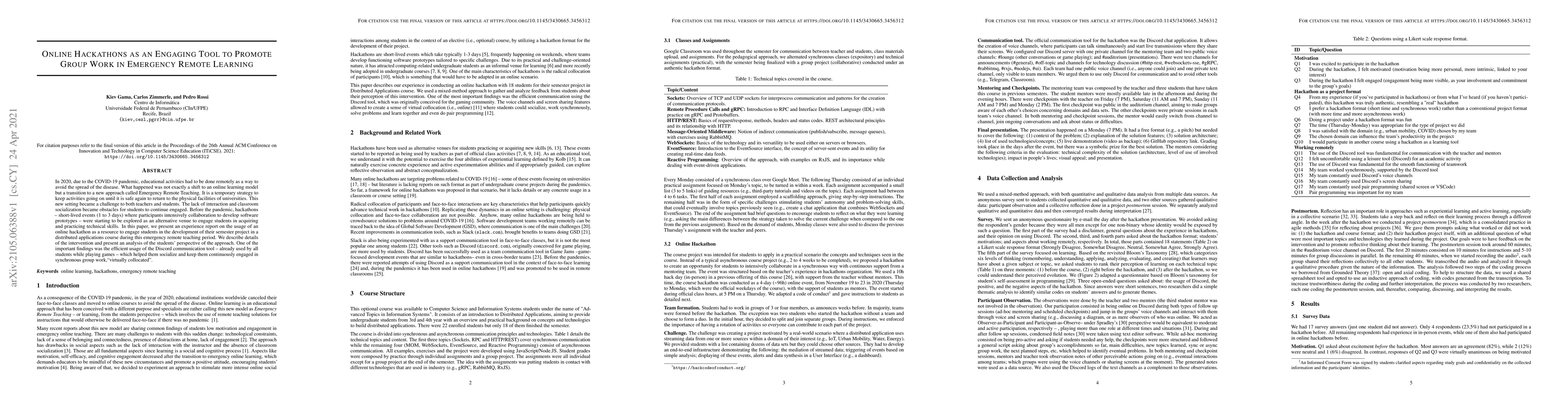 In 2020, due to the COVID-19 pandemic, educational activities had to be done remotely as a way to avoid the spread of the disease. What happened was not exactly a shift to an online learning model but a transition to a new approach called Emergency Remote Teaching. It is a temporary strategy to keep activities going on until it is safe again to return to the physical facilities of universities. This new setting became a challenge to both teachers and students. The lack of interaction and classroom socialization became obstacles for students to continue engaged. Before the pandemic, hackathons -- short-lived events (1 to 3 days) where participants intensively collaboration to develop software prototypes -- were starting to be explored as an alternative venue to engage students in acquiring and practicing technical skills. In this paper, we present an experience report on the usage of an online hackathon as a resource to engage students in the development of their semester project in a distributed applications course during this emergency remote teaching period. We describe details of the intervention and present an analysis of the students' perspective of the approach. One of the important findings was the efficient usage of the Discord communication tool -- already used by all students while playing games -- which helped them socialize and keep them continuously engaged in synchronous group work, "virtually collocated".