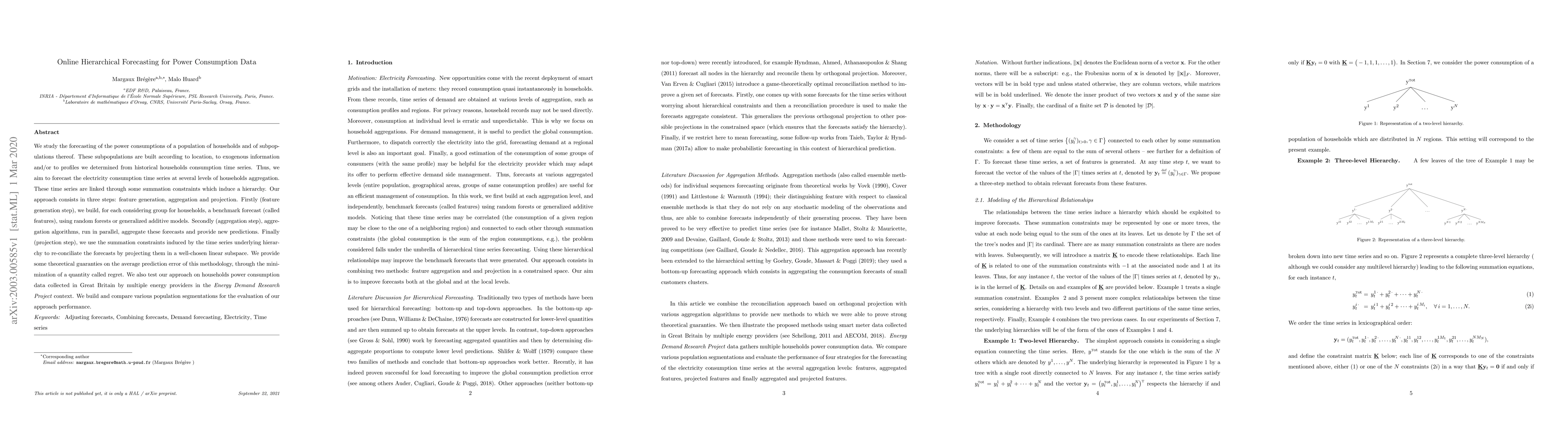 This paper proposes an online hierarchical forecasting method for power consumption data, aggregating forecasts at multiple levels of household aggregation while minimizing prediction error. The approach provides theoretical guarantees through regret minimization and is tested on real-world British households' energy consumption data.
