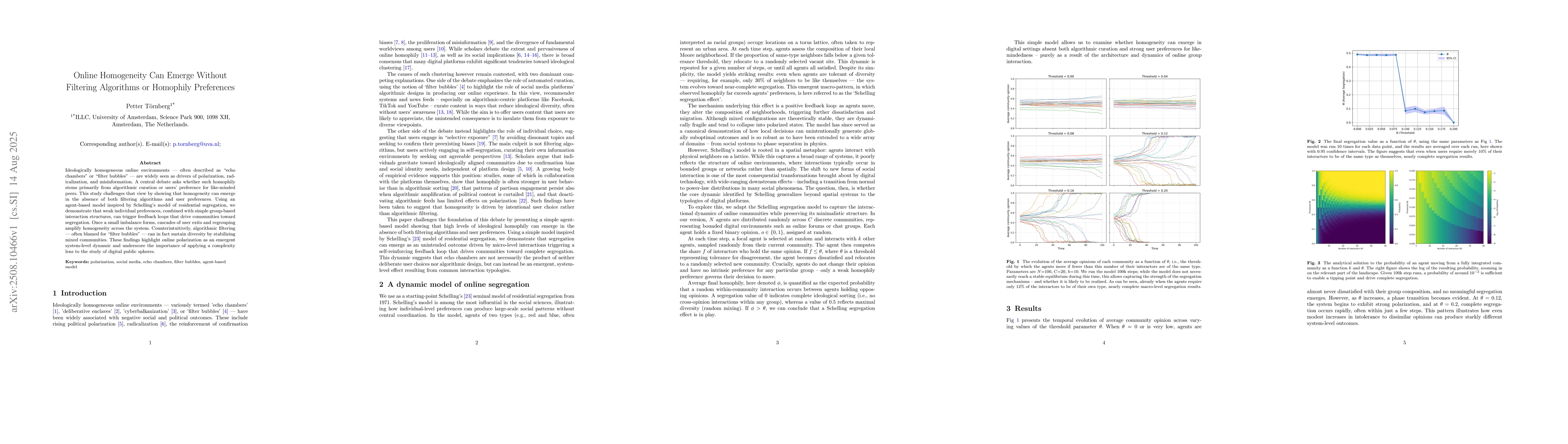 Ideologically homogeneous online environments - often described as "echo chambers" or "filter bubbles" - are widely seen as drivers of polarization, radicalization, and misinformation. A central debate asks whether such homophily stems primarily from algorithmic curation or users' preference for like-minded peers. This study challenges that view by showing that homogeneity can emerge in the absence of both filtering algorithms and user preferences. Using an agent-based model inspired by Schelling's model of residential segregation, we demonstrate that weak individual preferences, combined with simple group-based interaction structures, can trigger feedback loops that drive communities toward segregation. Once a small imbalance forms, cascades of user exits and regrouping amplify homogeneity across the system. Counterintuitively, algorithmic filtering - often blamed for "filter bubbles" - can in fact sustain diversity by stabilizing mixed communities. These findings highlight online polarization as an emergent system-level dynamic and underscore the importance of applying a complexity lens to the study of digital public spheres.