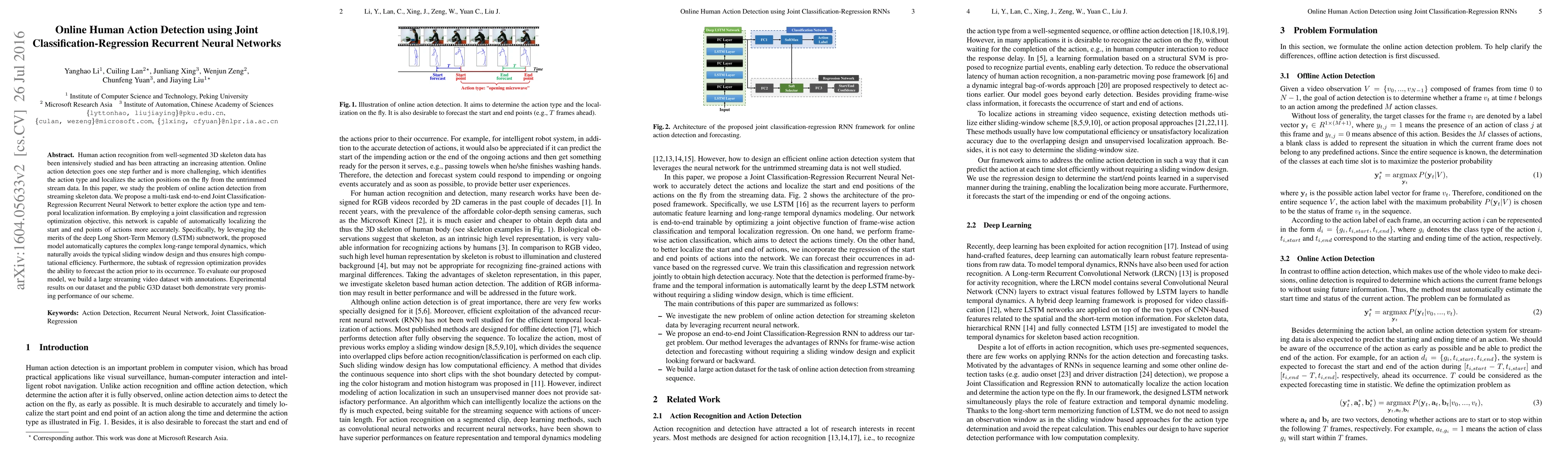 Researchers propose a new method for online human action detection from streaming skeleton data using a joint classification-regression recurrent neural network, achieving promising performance in both action type recognition and temporal localization.